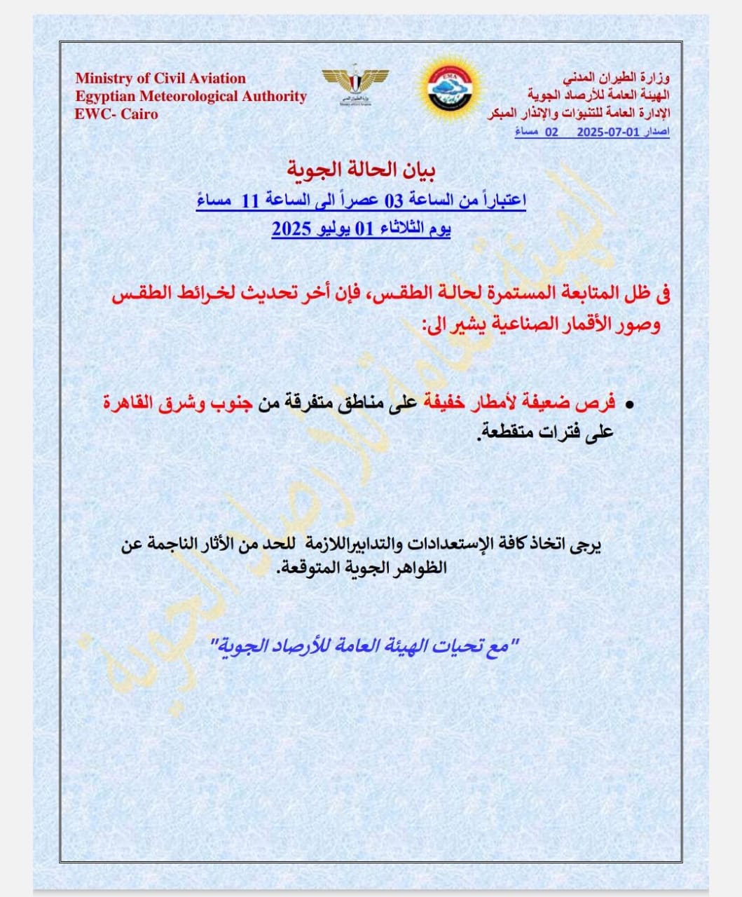 بيان هام من الأرصاد عن حالة الطقس اليوم من 3 عصراً إلى 11 مساءً