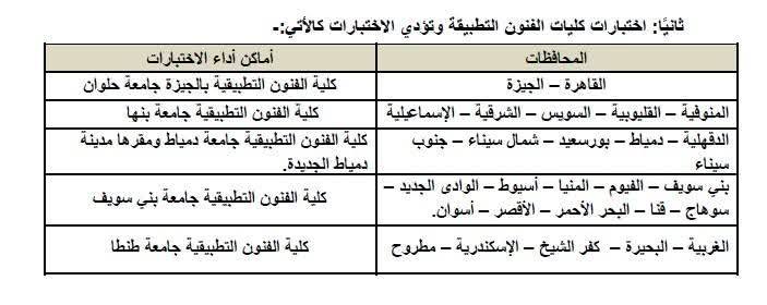 كليات الفنون التطبيقية بجامعات: حلوان، دمياط، بنها، بني سويف، طنطا، دمنهور.