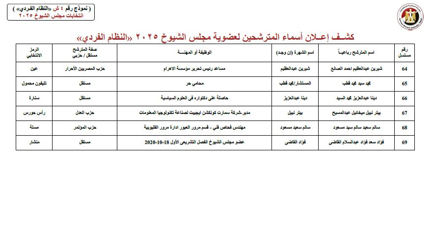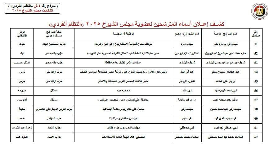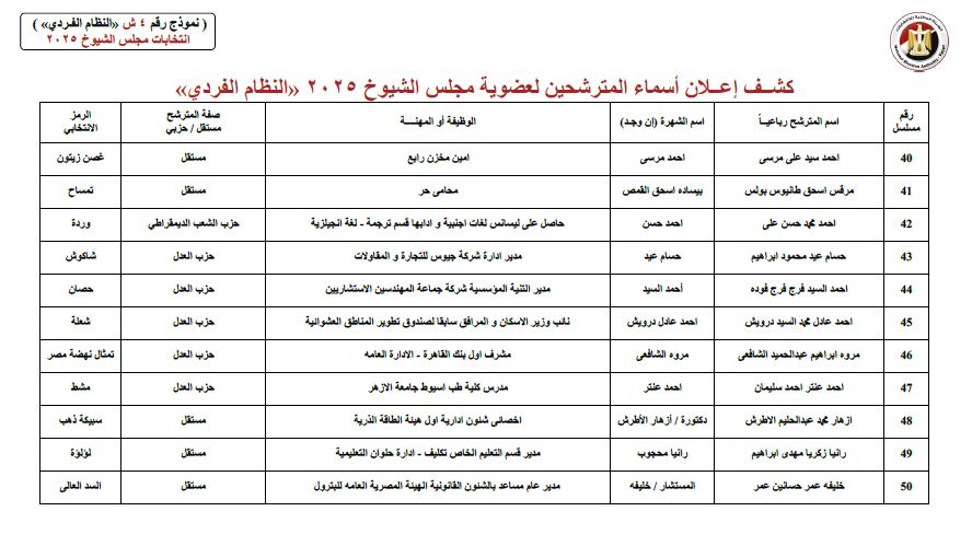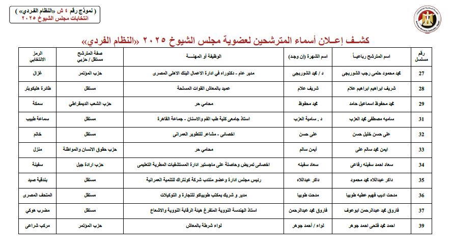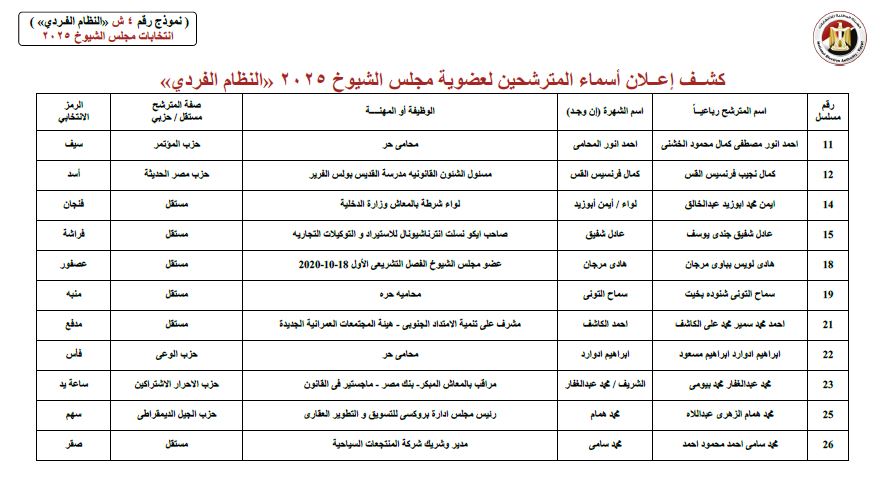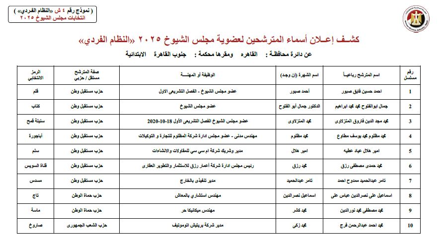 الكشوف المبدئية للمرشحين للمقاعد الفردية بمجلس الشيوخ 2025 ورموزهم في القاهرة