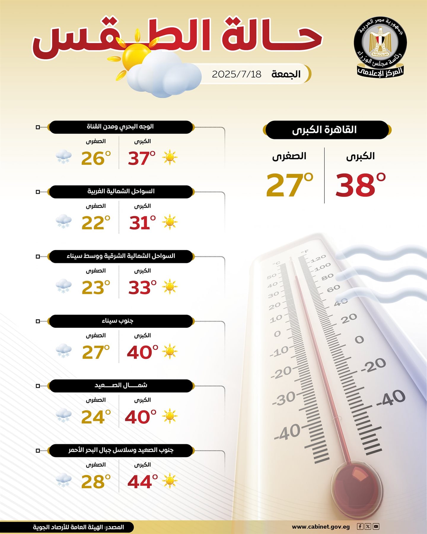 وفيما يلى بيان بدرجات الحرارة المتوقعة اليوم الجمعة على محافظات ومدن مصر: