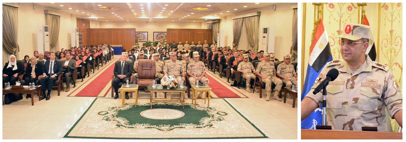 وألقى اللواء أ ح / هشام حسنى حسن قائد قوات الدفاع الشعبى والعسكرى كلمة نقل خلالها تحيات الفريق أول / عبد المجيد صقر القائد العام للقوات المسلحة وزير الدفاع والإنتاج الحربى والفريق / أحمد خليفة رئيس أركان حرب القوات المسلحة للحضور ، مؤكداً على أهمية إمتلاك شباب مصر للوعى الصحيح بحجم التحديات الراهنة وكيفية مجابهتها على نحو يعلى مصلحة الوطن فوق كل إعتبار .