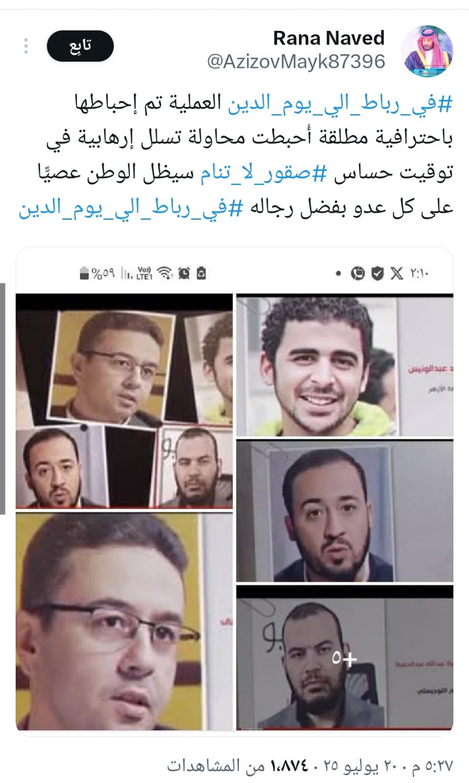 وأضاف اخر:" #في_رباط_الي_يوم_الدين العملية تم إحباطها باحترافية مطلقة أُحبطت محاولة تسلل إرهابية في توقيت حساس #صقور_لا_تنام سيظل الوطن عصيًّا على كل عدو بفضل رجاله #في_رباط_الي_يوم_الدين".