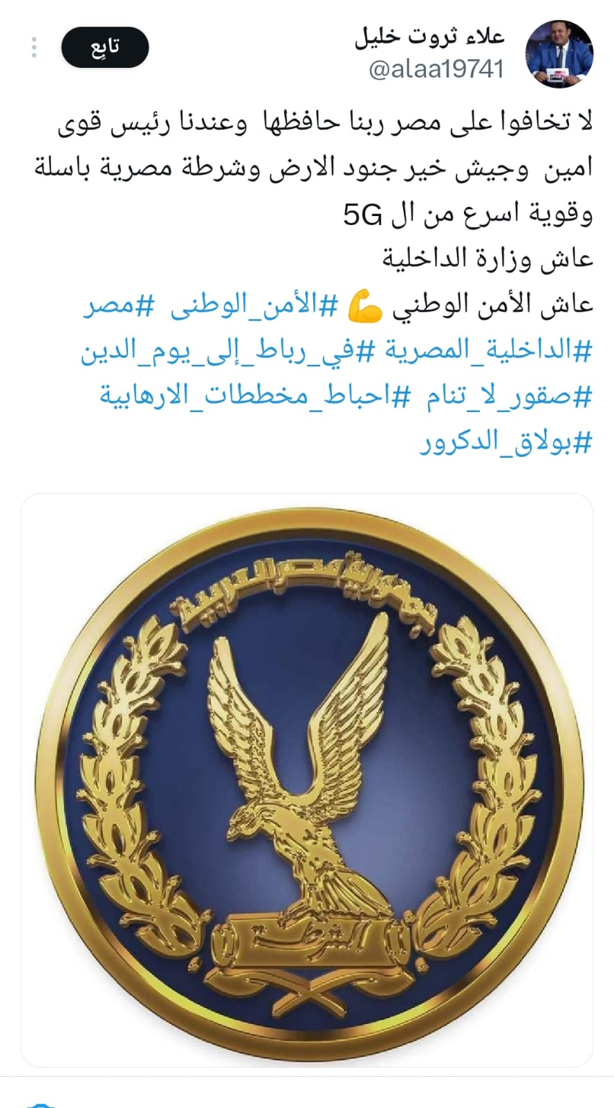 وتابع أحد راود موقع إكس:" لا تخافوا على مصر ربنا حافظها وعندنا رئيس قوى امين وجيش خير جنود الارض وشرطة مصرية باسلة وقوية اسرع من ال 5G عاش وزارة الداخلية، عاش الأمن الوطني 💪 #الأمن_الوطنى #مصر #الداخلية_المصرية #في_رباط_إلى_يوم_الدين #صقور_لا_تنام #احباط_مخططات_الارهابية #بولاق_الدكرور".