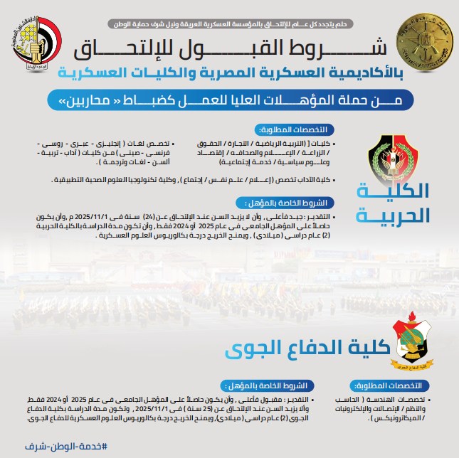 أعلن المتحدث العسكري، شروط القبول للإلتحاق بالأكاديمية العسكرية المصرية والكليات العسكرية من حملة المؤهلات العليا للعمل كضباط محاربين دفعة أكتوبر 2025.