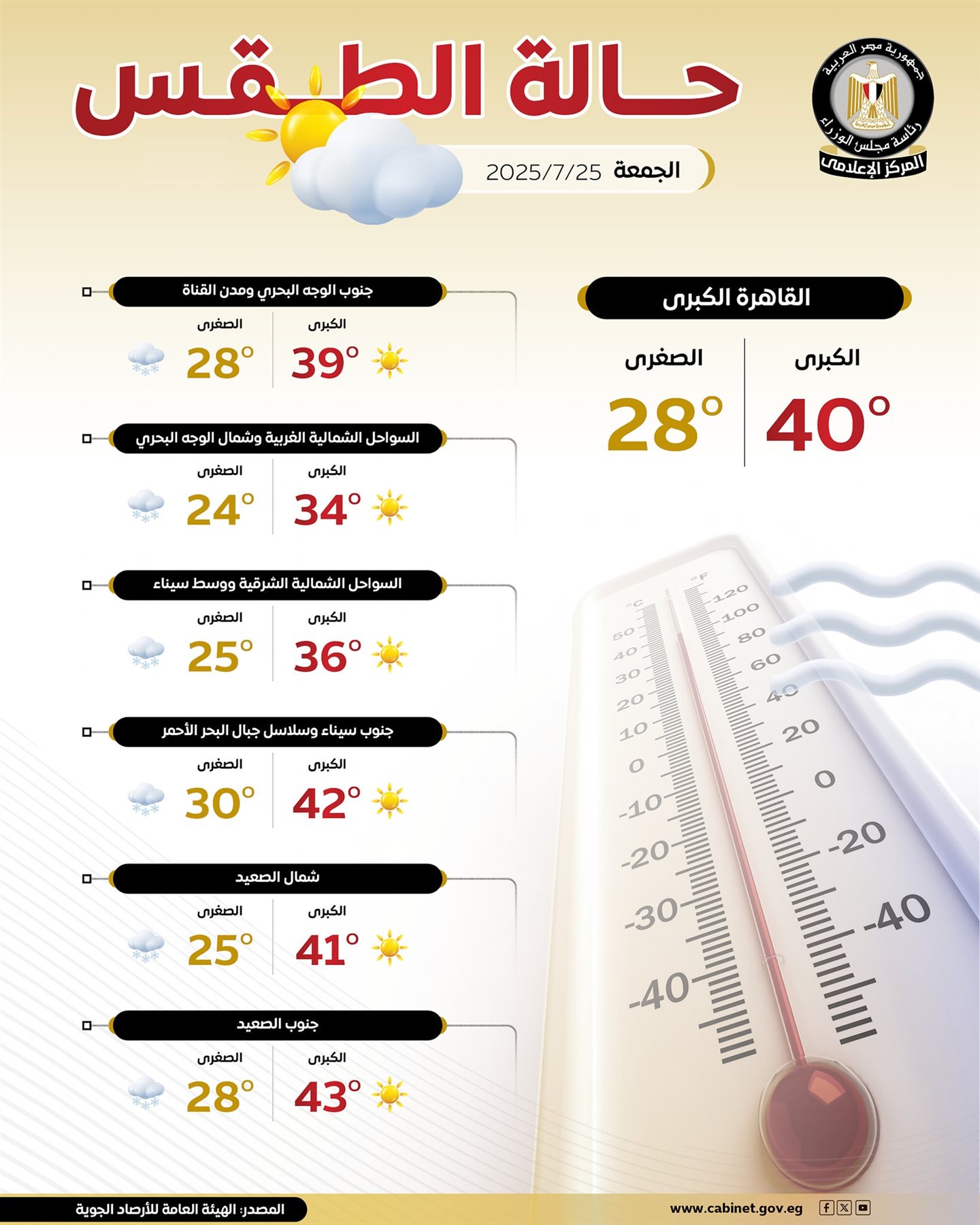 تبدأ ذروة الموجة الحارة مع مطلع الأسبوع وتستمر حتى يوم الثلاثاء المقبل، حيث تظل درجات الحرارة العظمى في القاهرة الكبرى أعلى من 40 درجة مئوية، في حين تشهد محافظات الصعيد درجات حرارة أعلى قد تصل إلى 44 أو 46 درجة في بعض المناطق مثل الأقصر وأسوان.