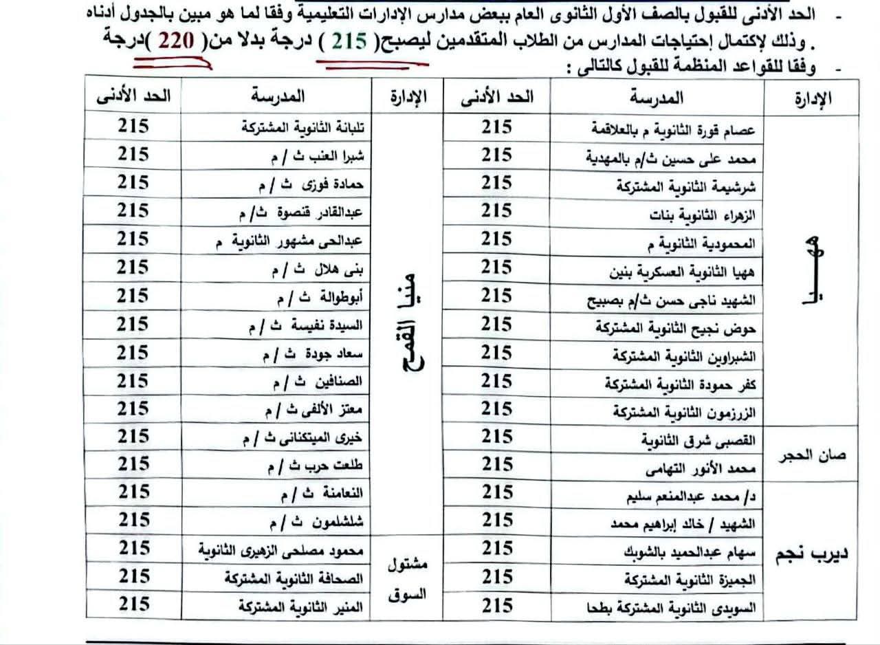في استجابة عملية لاحتياجات العملية التعليمية وتحقيقًا للكثافات المستهدفة داخل مدارس التعليم الثانوي العام، أصدر المهندس حازم الأشموني محافظ الشرقية، قرارًا بالنزول بالحد الأدنى لتنسيق القبول بالصف الأول الثانوي العام للعام الدراسي 2025/2026 إلى 215 درجة بدلاً من 220 درجة، وذلك بعدد من المدارس على مستوى المحافظة، وفقًا للكشف المُرفق.