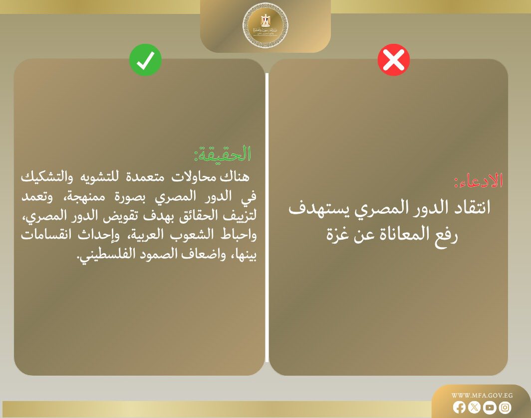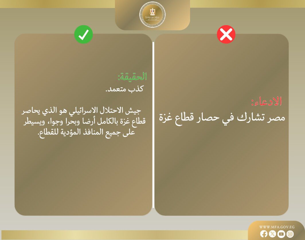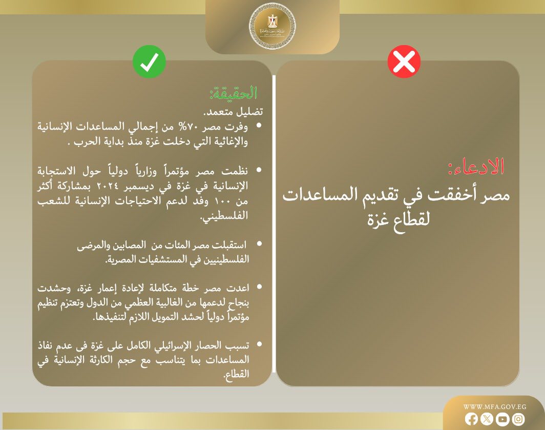 الحقيقة: الحملة ضد مصر محاولة لتقويض دورها وتشويه صورتها، وتخدم الاحتلال عبر إضعاف الروح المعنوية للشعوب العربية، والتقليل من الدور المصري في حماية حقوق الشعب الفلسطيني.