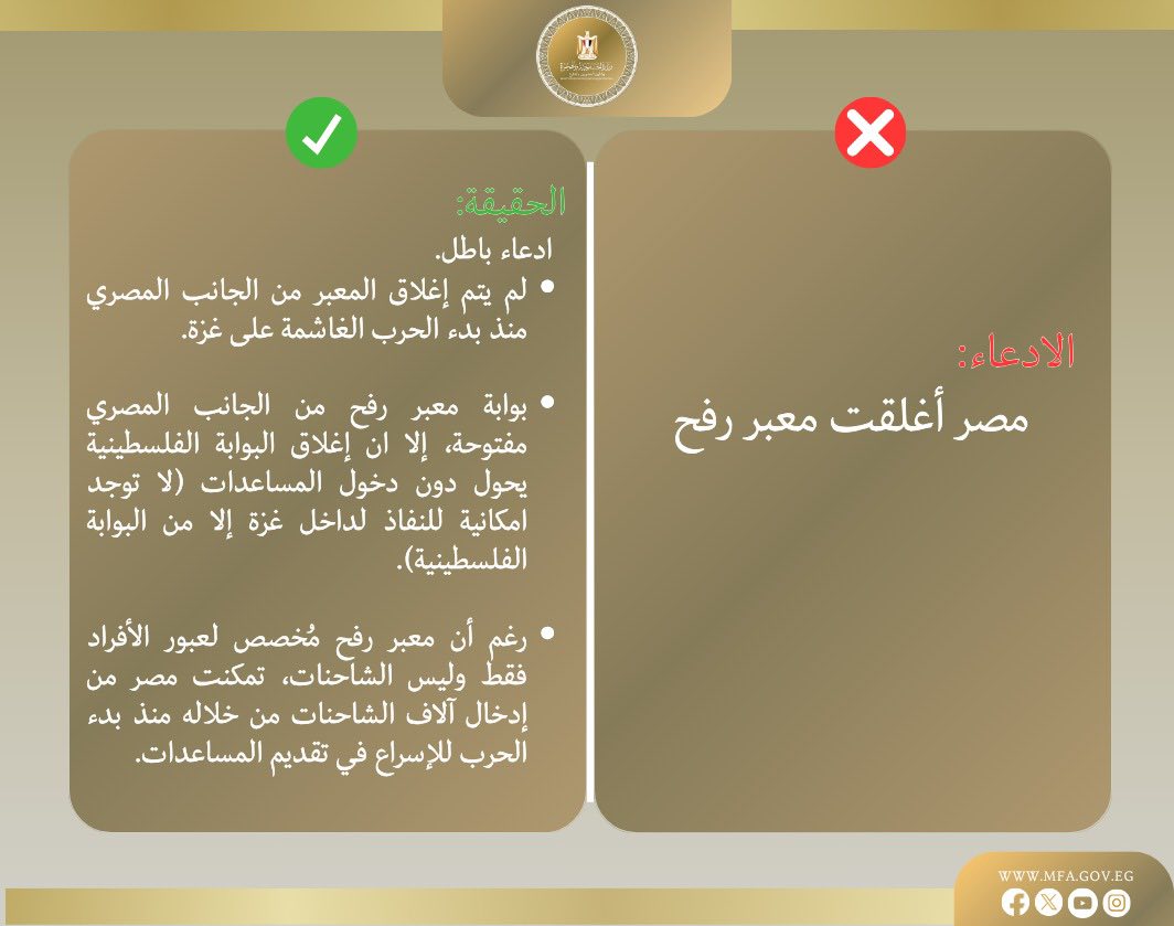 الحقيقة: المعبر لم يُغلق من الجانب المصري منذ بدء الحرب، بل ظلت بوابته مفتوحة، لكن الإغلاق الإسرائيلي للبوابة الفلسطينية هو الذي يمنع دخول المساعدات، ورغم ذلك نجحت مصر في إدخال آلاف الشاحنات عبر المعبر للإسراع بتقديم الدعم الإنساني.
