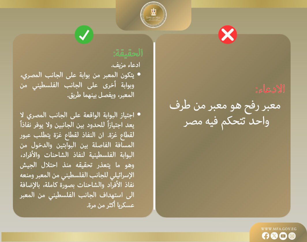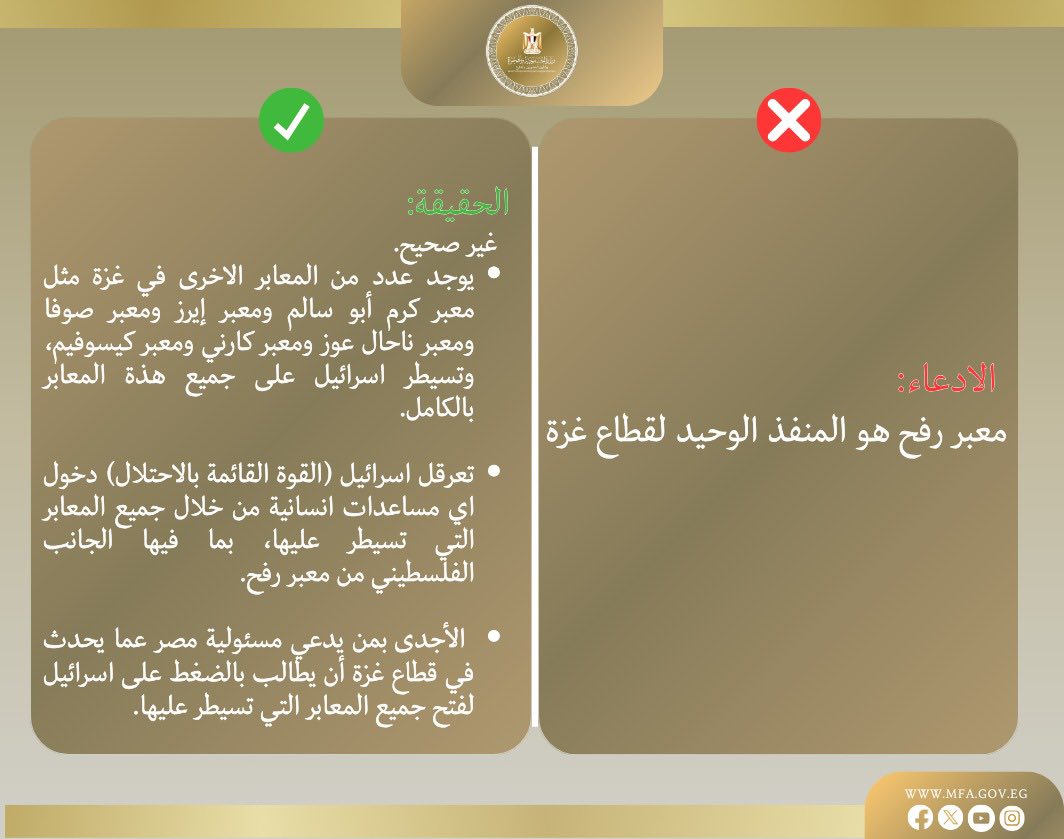 الحقيقة: هناك عدة معابر أخرى تسيطر عليها إسرائيل، ومطالبة مصر وحدها بفتح معبر رفح يتجاهل الواقع الميداني ومسؤولية القوة القائمة بالاحتلال.