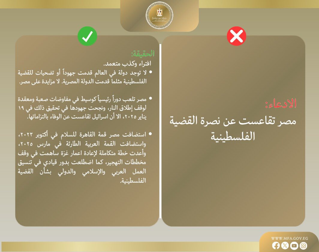 الحقيقة: مصر اضطلعت بدور محوري في دعم القضية الفلسطينية، واستضافت قمة القاهرة للسلام، القمة العربية الطارئة، ومؤتمرات لإعادة الإعمار، كما ساهمت في وقف مخططات التهجير ولعبت دور الوسيط الرئيسي في مفاوضات وقف إطلاق النار.