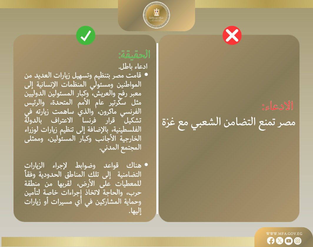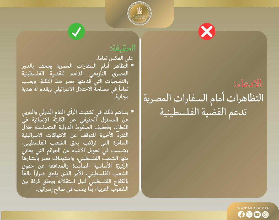 الحقيقة: التظاهرات ضد مصر تخدم الاحتلال الإسرائيلي، وتساهم في تشتيت الرأي العام العربي والدولي عن الانتهاكات الإسرائيلية، وتضر بالكفاح الفلسطيني.
