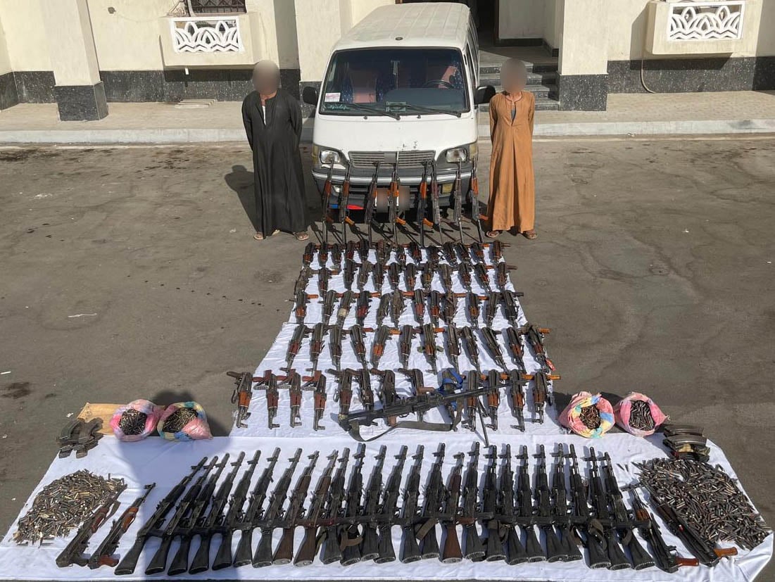 عقب تقنين الإجراءات تم ضبطهما بالمنطقة الجنوبية للبلاد، وبحوزتهما 105 قطعة سلاح نارى (رشاش جرينوف – 100 بندقية آلية – 4 طبنجات – كمية كبيرة من الطلقات النارية) وتقدر القيمة المالية للمضبوطات بحوالى 22 مليون جنيه، وتم اتخاذ الإجراءات القانونية.