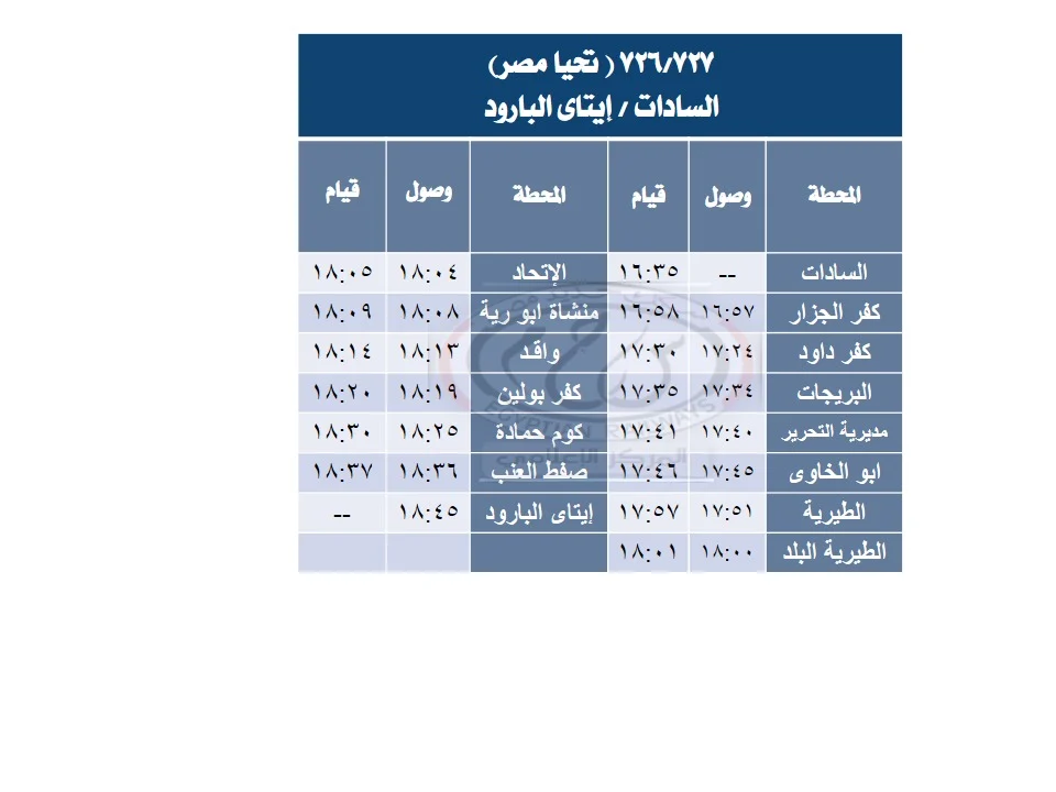 وتقرر اعتباراً من يوم الثلاثاء الموافق 5 / 8 / 2025 تشغيل قطار رقم 724 / 725 ( إيتاي البارود – السادات ) وقطار رقم 727 / 726 ( السادات / إيتاي البارود )، وتعمل جميع أيام الأسبوع ماعدا يوم الجمعة والعطلات الرسمية وطبقاً للجداول المرفقة.