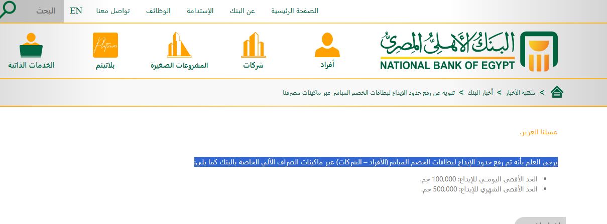 أعلن البنك الأهلي المصري، اليوم الإثنين، رفع الحدود القصوى للإيداع اليومية لبطاقات الخصم المباشر (الأفراد والشركات) بأكثر من 200% عبر ماكينات الصراف الآلي الخاصة بالبنك لأول مرة منذ عام.
