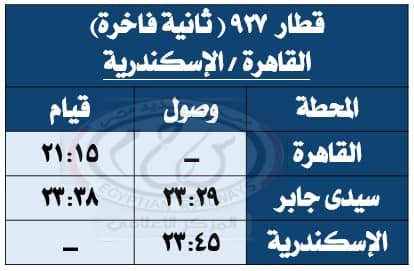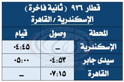 وقررت الهيئة اعتباراً من يوم الثلاثاء الموافق 12 / 8 / 2025 تشغيل قطار 927 ( ثانية فاخرة) القاهرة / الإسكندرية حيث يقوم من القاهرة الساعة 21:15 ويصل الإسكندرية الساعة 23:45 طبقاً للجدول المرفق ، واعتباراً من يوم الأربعاء الموافق 13 / 8 / 2025 تشغيل قطار 926 ( ثانية فاخرة ) الإسكندرية / القاهرة حيث يقوم من الإسكندرية الساعة 04:45 ويصل القاهرة الساعة 07:15 طبقاً للجدول المرفق.