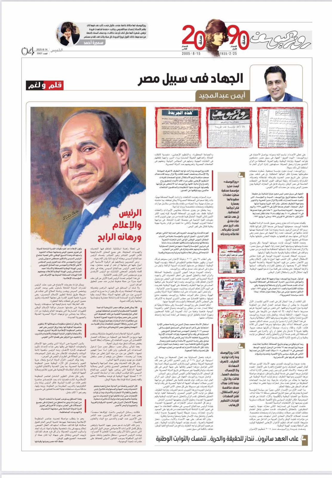 صدر عدد جريدة روزاليوسف التذكاري، اليوم الجمعة، في الذكرى العشرين للإصدار الثاني الصادر 15 أغسطس 2025، وذلك تحت عنوان «الجهاد في سبيل مصر».