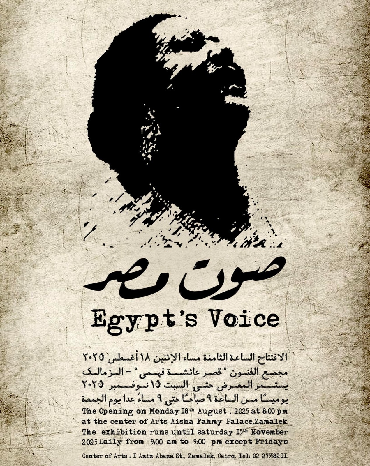 في إطار البرنامج الثقافي والفني لوزارة الثقافة احتفاءً بعام كوكب الشرق أم كلثوم، تجري الاستعدادات النهائية لانطلاق المعرض الفني الكبير صوت مصر، والذي يفتتحه الدكتور أحمد فؤاد هنو وزير الثقافة، في الثامنة من مساء الاثنين 18 أغسطس 2025، بمجمع الفنون (قصر عائشة فهمي) بالزمالك.