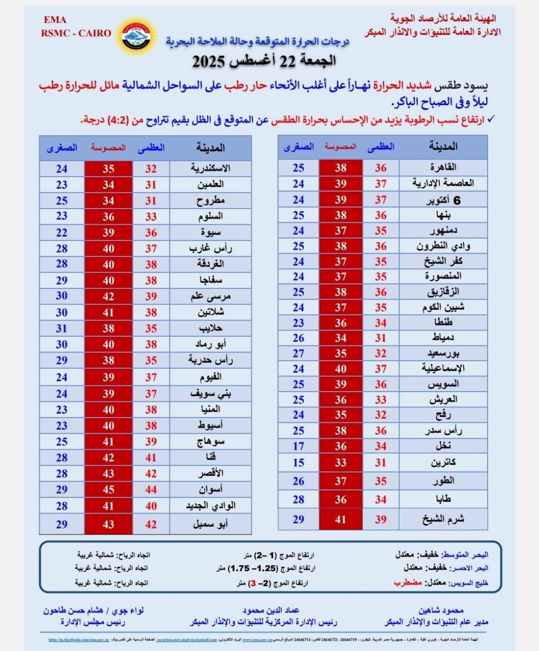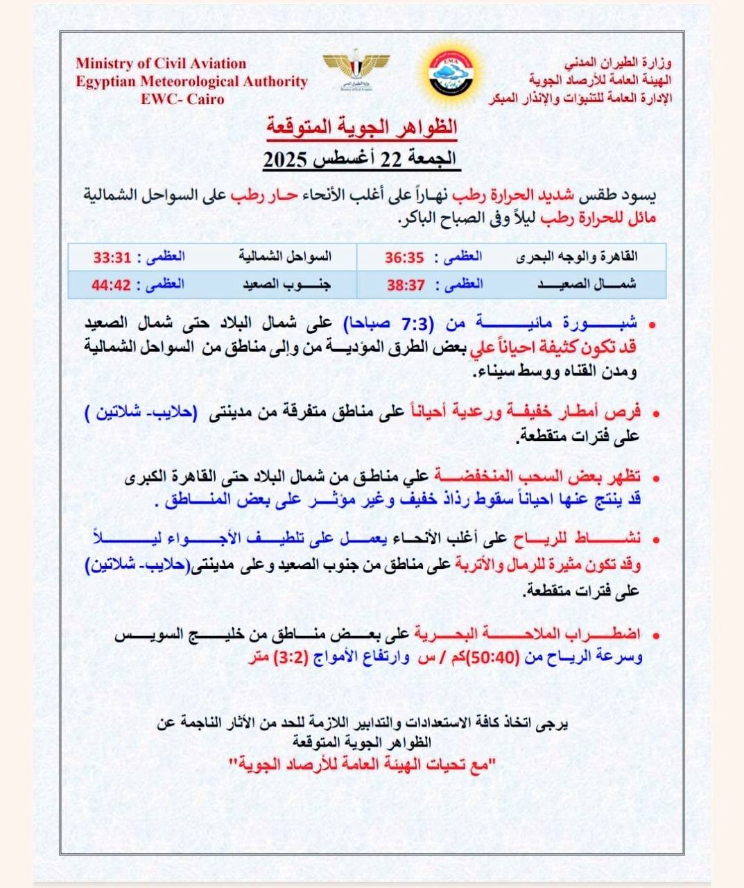 كشف خبراء الهيئة العامة للأرصاد الجوية، عن الظواهر الجوية المتوقعة الجمعة 22- 8- 2025؛ حيث يسود طقس شديد الحرارة رطب نهارًا على أغلب الأنحاء، حار رطب على السواحل الشمالية مائل للحرارة رطب ليلا وفي الصباح الباكر.