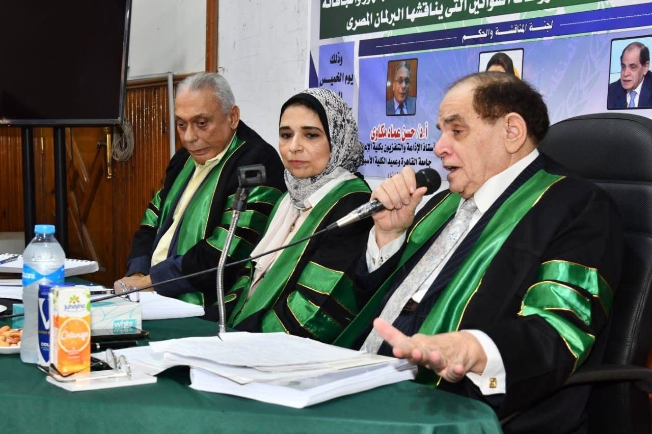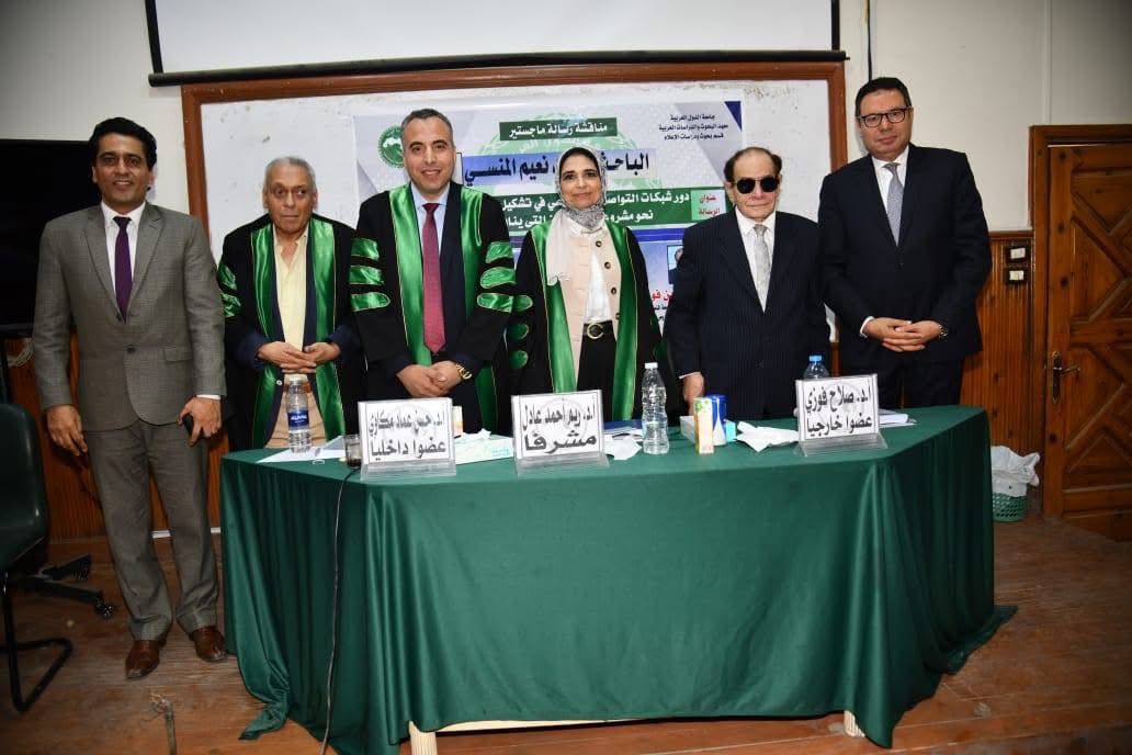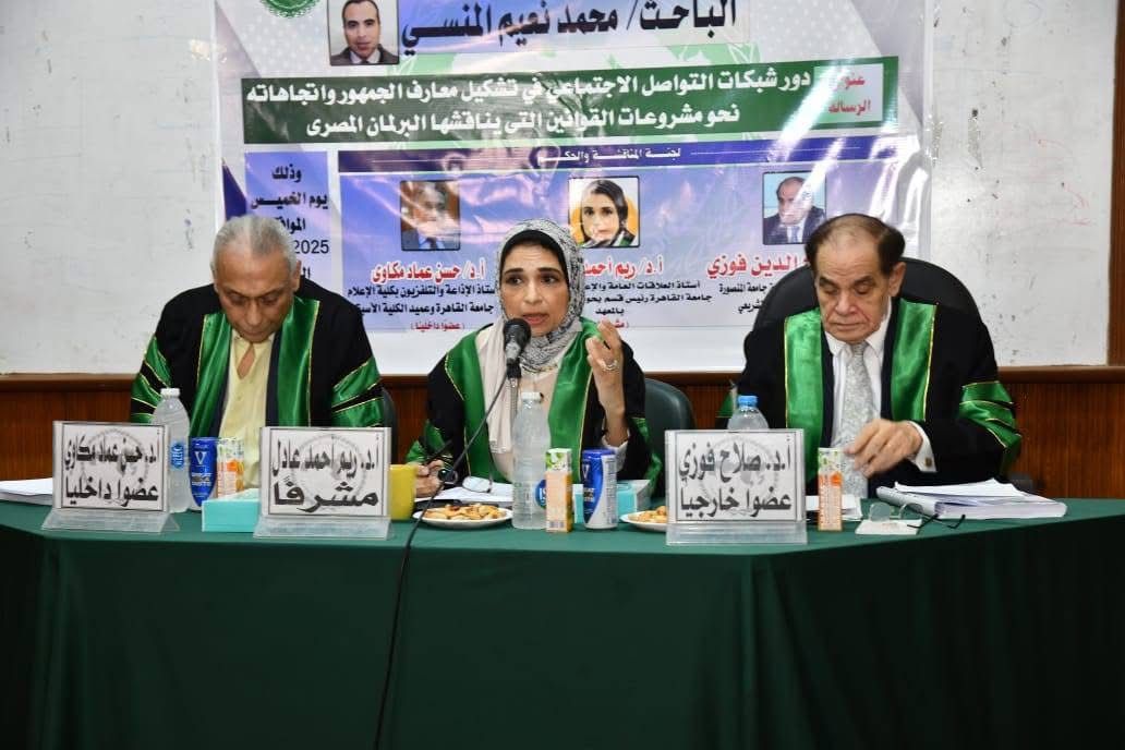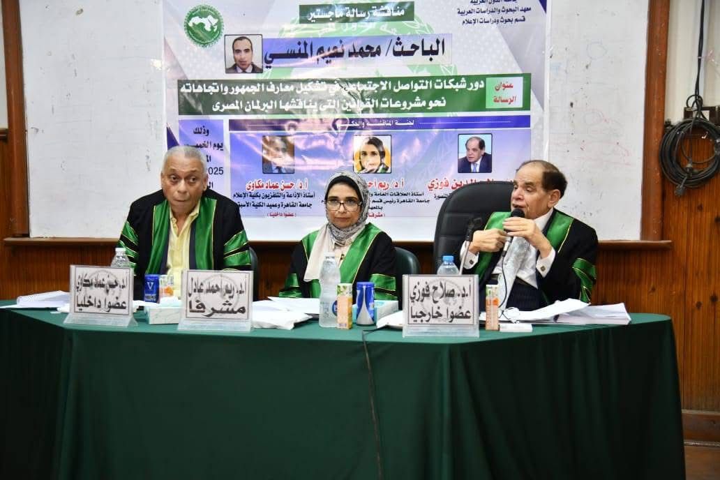 وترأست لجنة المناقشة الأستاذة الدكتورة ريم أحمد عادل رئيس قسم بحوث ودراسات الإعلام بالمعهد، وعضوية كل من: الأستاذ الدكتور حسن عماد مكاوي أستاذ الإذاعة والتليفزيون بكلية الإعلام جامعة القاهرة، عميد الكلية الأسبق، والأستاذ الدكتور صلاح الدين فوزي الفقيه الدستوري، أستاذ القانون العام بكلية الحقوق جامعة المنصورة، عضو اللجنة العليا للإصلاح التشريعي.