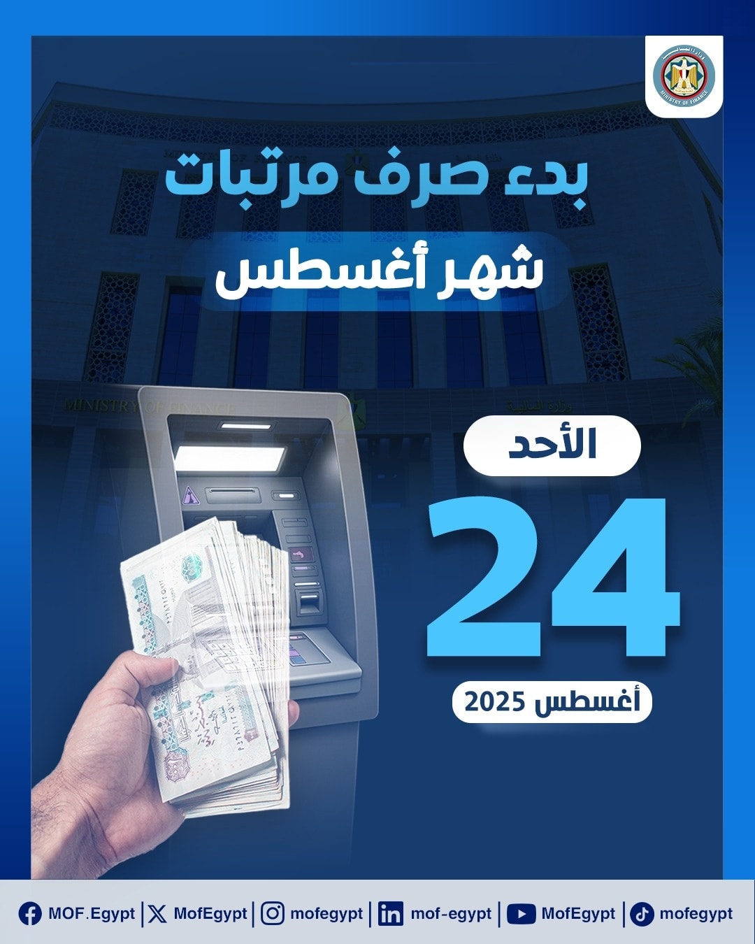 وأكدت الوزارة أن المرتبات ستكون متاحة في أي وقت في الفترة من الأحد 24 أغسطس وحتى الخميس 28 أغسطس، عبر فروع البنوك، ومكاتب البريد، وماكينات الصراف الآلي، وذلك وفقًا للجدول الزمني المقرر ضمن المنظومة المالية الإلكترونية.
