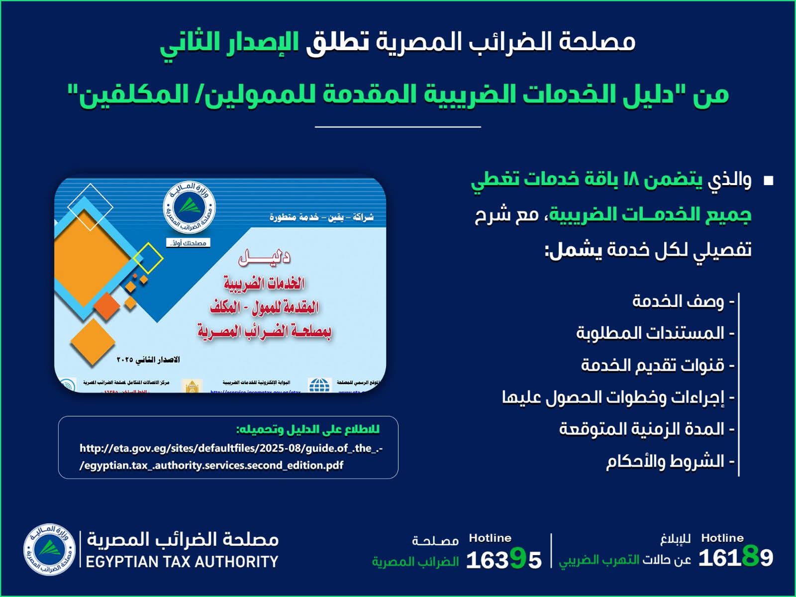 وقالت رئيس المصلحة، في بيان اليوم، إن الإصدار الجديد متاح على الموقع الرسمي لمصلحة الضرائب، مشيرة إلى أن الدليل يوضح بالتفصيل كافة المعلومات التي يحتاجها الممول/ المكلف عن الخدمات التي تقدمها المصلحة من حيث وصف للخدمة، المستندات المطلوبة للحصول على الخدمة، قنوات تقديم الخدمة، إجراءات وخطوات الحصول عليها، التوقيت المتوقع للحصول على الخدمة، والشروط والأحكام المرتبطة بها.