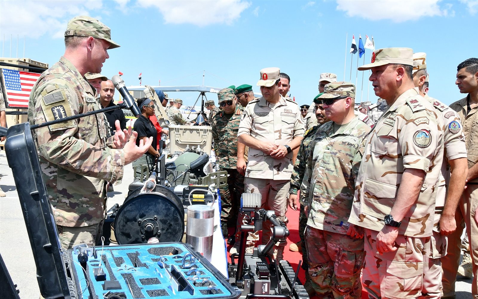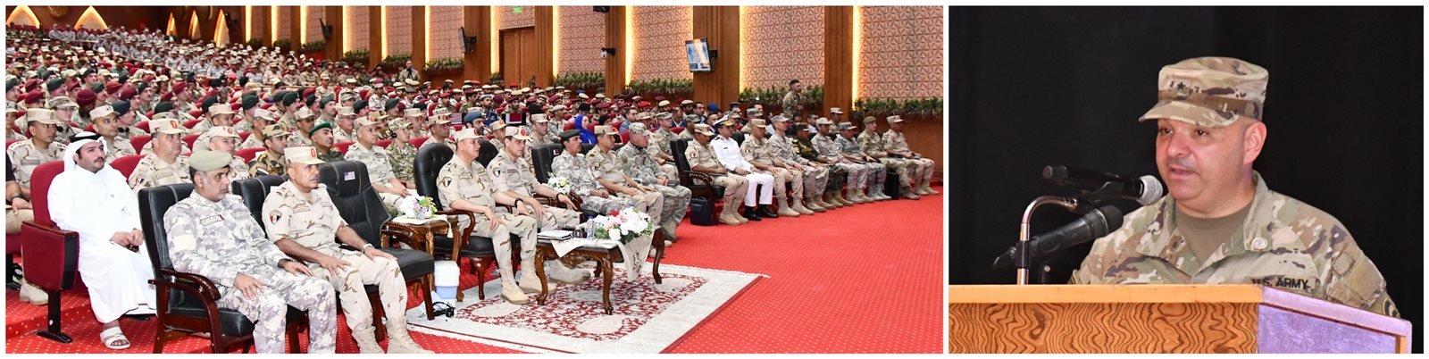 كما ألقى العميد / باتريك كلير مدير التدريب من الجانب الأمريكى كلمة أعرب خلالها عن تقديره لكافة الجهود التى قامت بها القوات المسلحة المصرية لإستضافة هذا التدريب الضخم مما يعكس حجم المجهودات المبذولة والإعداد والتخطيط الراقى الذى يجعل من التدريب فرصة مناسبة لتبادل الخبرات والإطلاع على مختلف الثقافات العسكرية بين المشاركين فى التدريب .