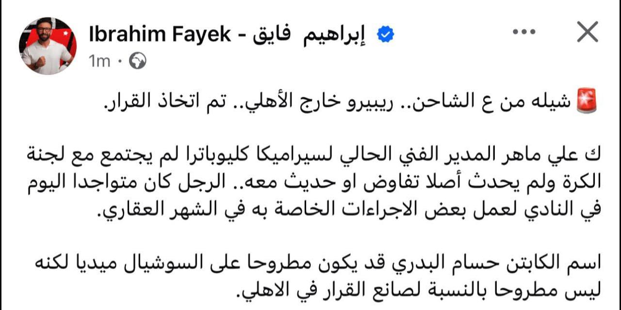 وكتب إبراهيم فايق عبر حسابه الشخصي بموقع التواصل الاجتماعي "فيس بوك": "شيله من على الشاحن.. ريبيرو خارج الأهلي.. تم اتخاذ القرار".