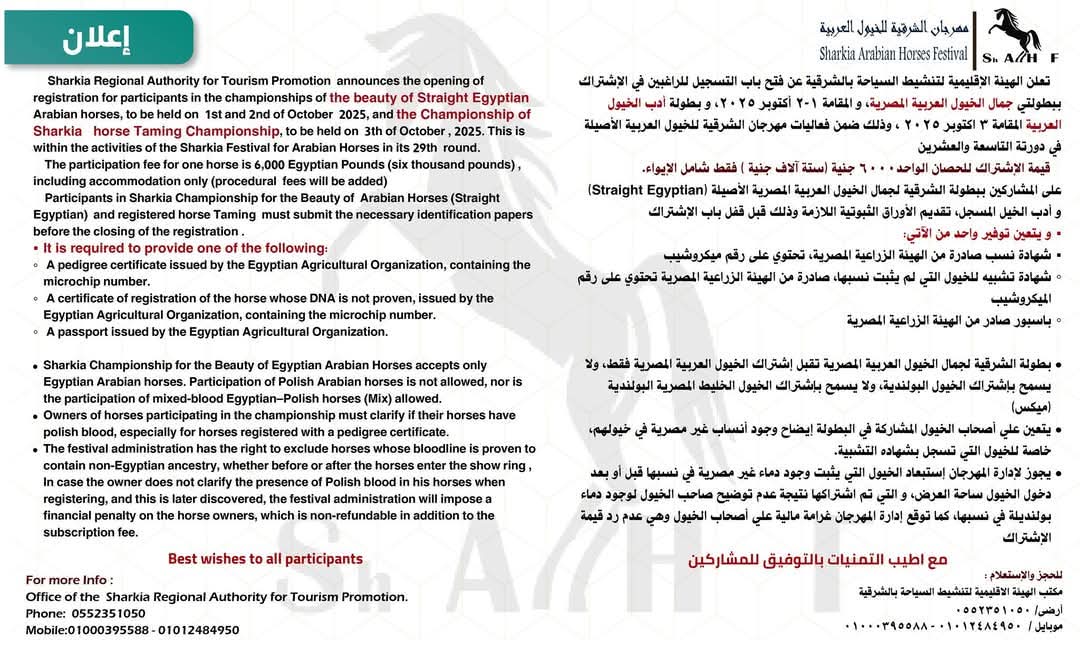 ومن جانبها، أعلنت الدكتورة رشا حسن، مديرة الهيئة الإقليمية لتنشيط السياحة، عن فتح باب التسجيل للمشاركة في بطولة جمال الخيول العربية المصرية الأصيلة، المقرر تنظيمها يومي 1 و2 أكتوبر، تليها بطولة أدب الخيل يوم 3 أكتوبر 2025. وأشارت إلى أن المشاركة تقتصر على الخيول العربية المصرية الأصيلة (Straight Egyptian)، مع قبول الخيول المسجلة وغير المسجلة في بطولة الأدب، بينما يُمنع إشراك الخيول المختلطة السلالات في بطولة الجمال.