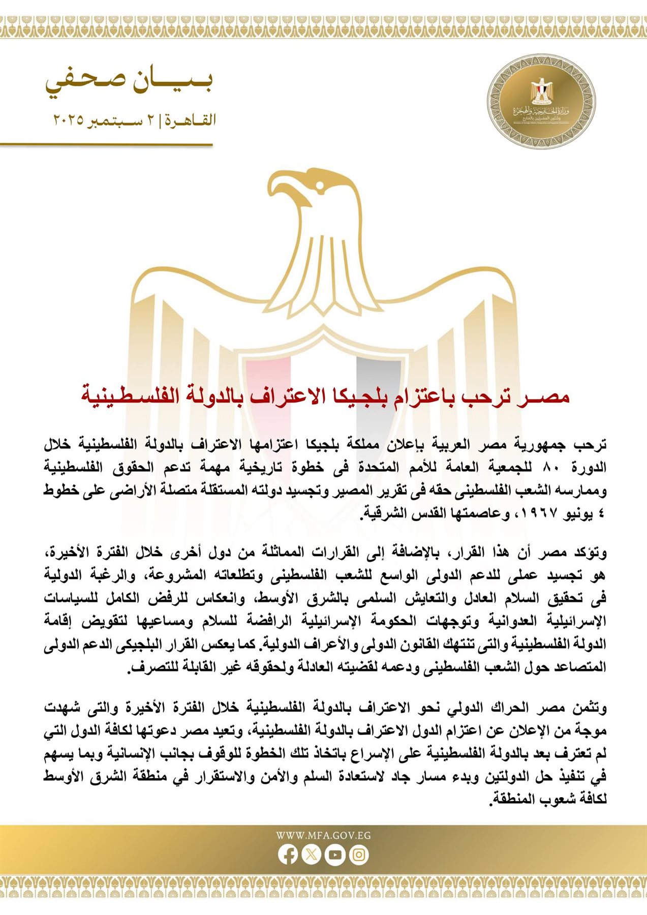 ترحب مصر بإعلان مملكة بلجيكا اعتزامها الاعتراف بالدولة الفلسطينية خلال الدورة 80 للجمعية العامة للأمم المتحدة في خطوة تاريخية مهمة تدعم الحقوق الفلسطينية وممارسه الشعب الفلسطيني حقه في تقرير المصير وتجسيد دولته المستقلة متصلة الأراضي على خطوط يونيو ١٩٦٧، وعاصمتها القدس الشرقية.