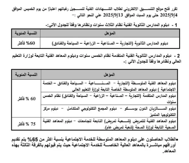 دبلوم المعاهد الفنية المتوسطة (التجارية - الصنـاعية - السياحة والفنادق –الخدمة الاجتماعية ) دبلوم المعاهد المتوسطة الخاصة التابعة لوزارة التعليم العالي 60 % فأكثر.