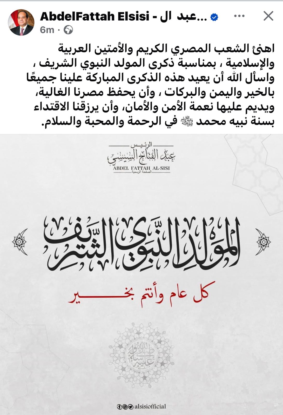 الرئيس السيسي يهنئ الشعب المصري الكريم والأمتين العربية والإسلامية بذكرى المولد النبوي