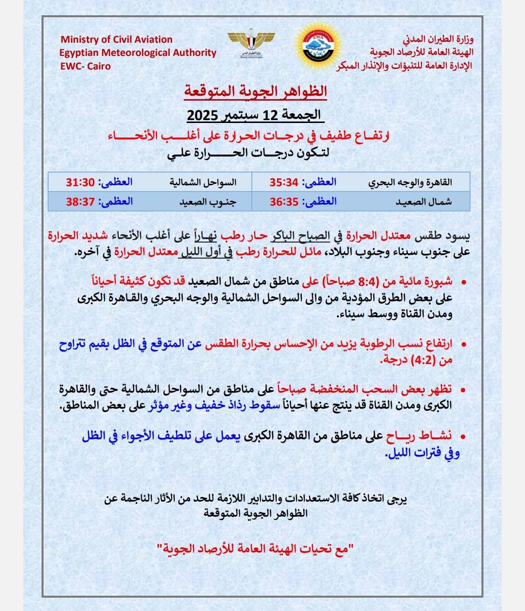 يتوقع خبراء الهيئة العامة للأرصاد الجوية، أن يشهد غدا الجمعة 12- 9- 2025، ارتفاعا طفيفا في درجات الحرارة على أغلب الأنحاء يسود طقس معتدل الحرارة في الصباح الباكر، حار رطب نهاراً على أغلب الأنحاء شديد الحرارة رطب على جنوب سيناء وجنوب البلاد مائل للحرارة رطب في أول الليل معتدل الحرارة في آخره.