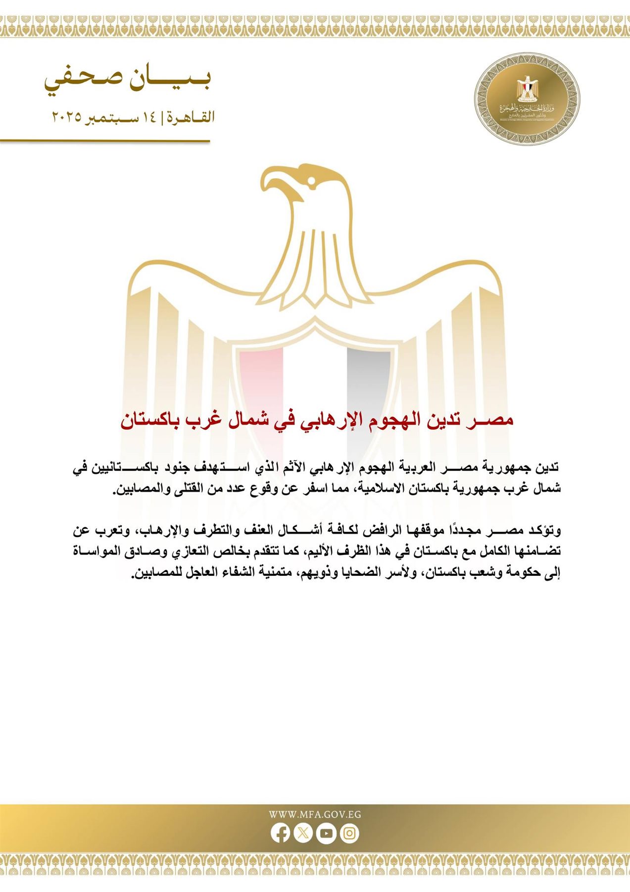 وتؤكد مصر مجددًا موقفها الرافض لكافة أشكال العنف والتطرف والإرهاب، وتعرب عن تضامنها الكامل مع باكستان في هذا الظرف الأليم.