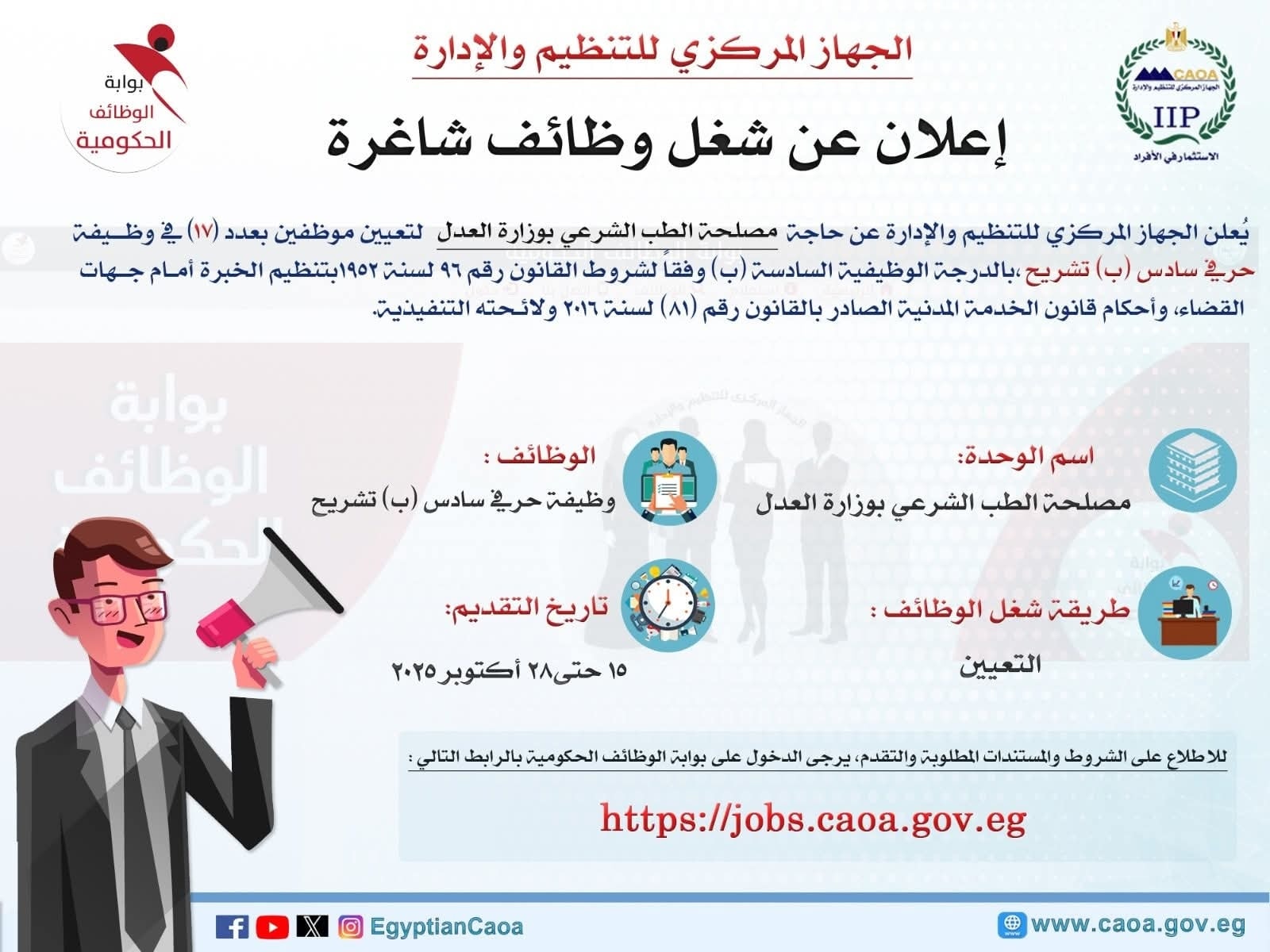 يُعلن الجهاز المركزي للتنظيم والإدارة، برئاسة المهندس حاتم نبيل، عن حاجة مصلحة الطب الشرعي بوزارة العدل لتعيين (15) في وظيفة معاون طبيب شرعي معملي، و(29) في وظيفة معاون طبيب شرعي ميداني بالدرجة الوظيفية الثالثة، بالإضافة إلى تعيين (17) في وظيفة حرفي سادس (ب) تشريح بالمستوى الوظيفي السادس (ب).