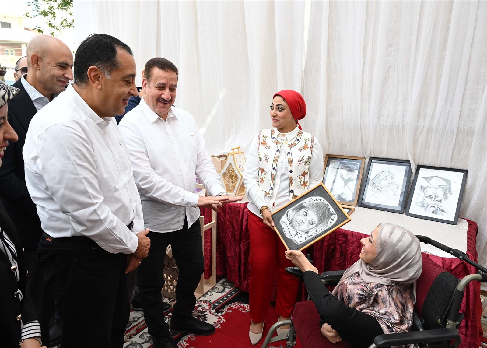 كما توقف الدكتور مصطفى مدبولي عند عدة نقاط في المعرض، من بينها أحد العارضين الذي يدمج القطاع الأكاديمي بالحرفي، من طلبة كليات التربية النوعية بجامعة المنوفية، كما توقف عند معرض طلاب مدرسة الأمل للصم والبكم، والذين عرضوا منتجاتهم في قسم الزخرفة والملابس، وأدار حديثاً مع إحدى العارضات من ذوي الهمم، تعرض لوحات رسم على الفحم، والتي طلبت فرصة عمل، ووجه رئيس الوزراء المحافظ بتوفير فرصة عمل لها.