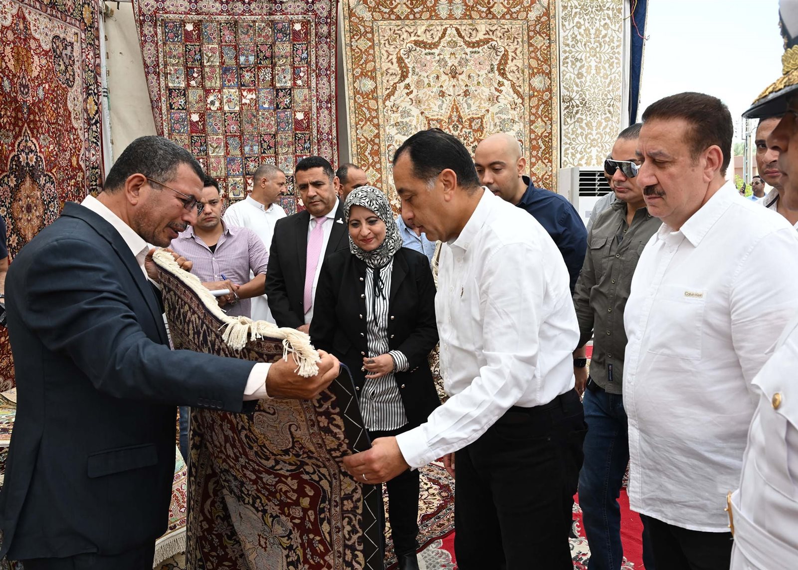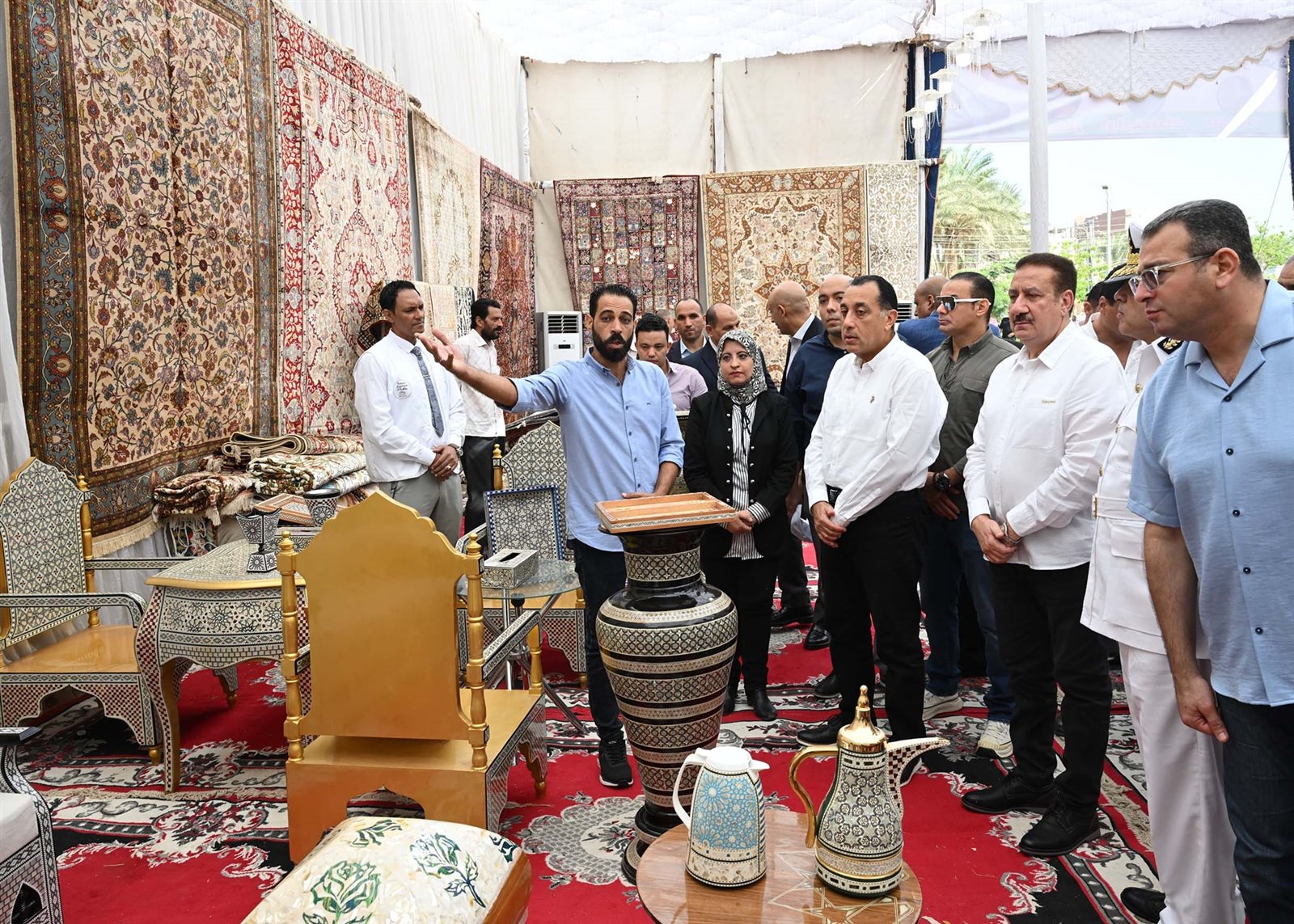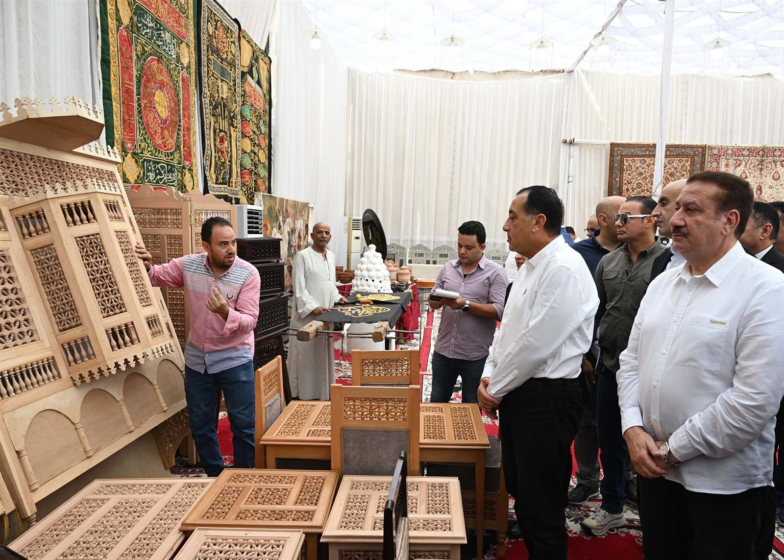 وتفقد رئيس الوزراء جانباً من أقسام المعرض وتعرف على منتجاته المتنوعة، وأدار حواراً مع العارضين والعارضات، حيث أشاد بجودة الصناعات الحرفية بالمعرض بشكل عام، والسجاد اليدوي بشكل خاص.