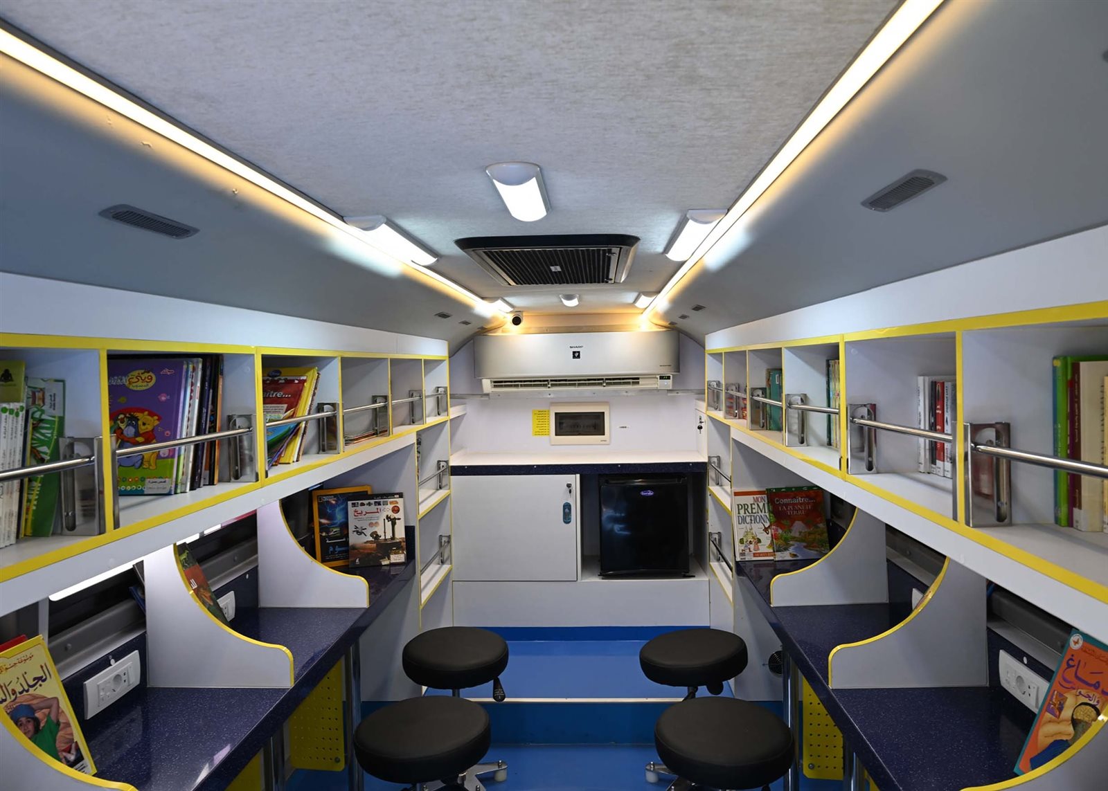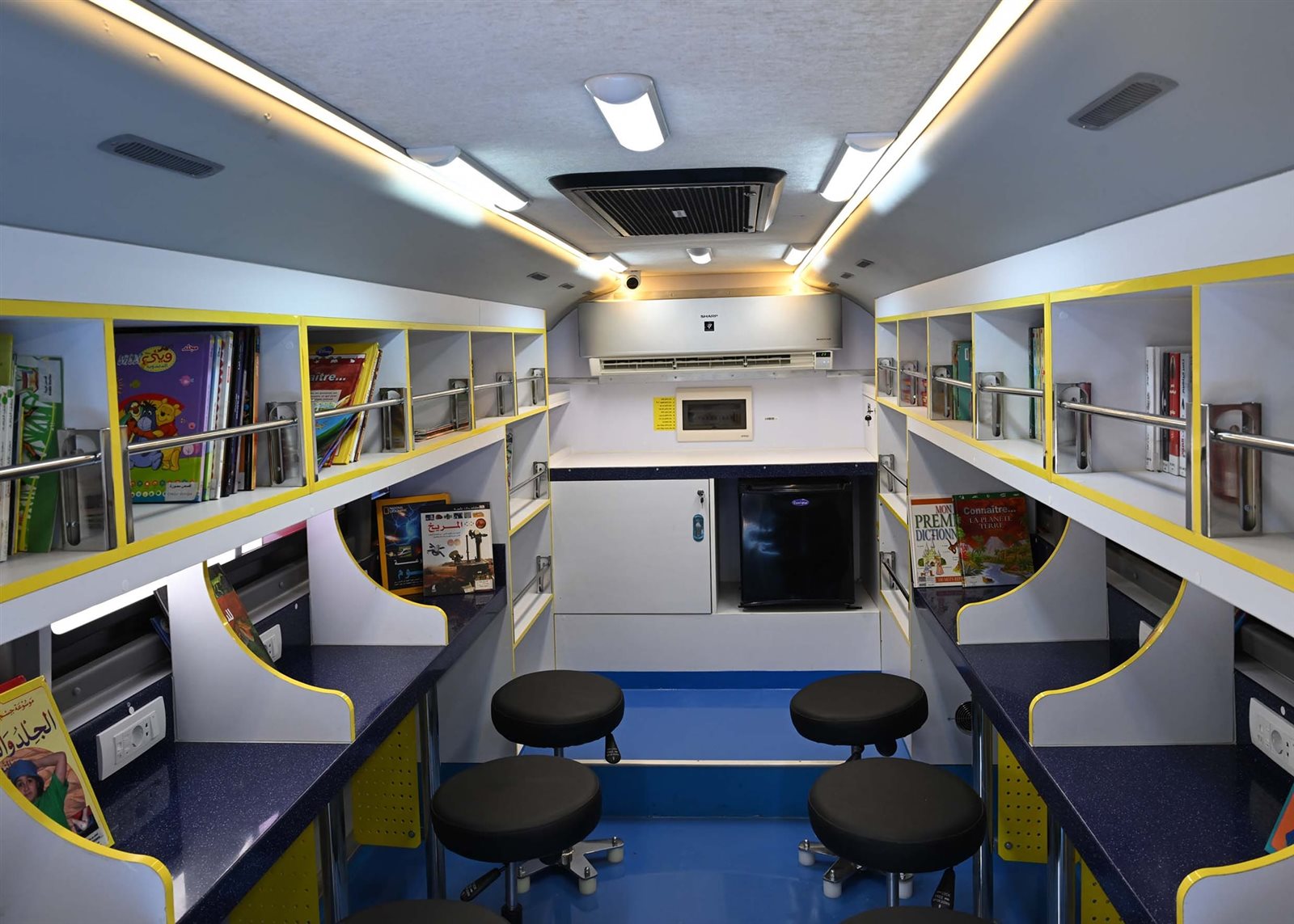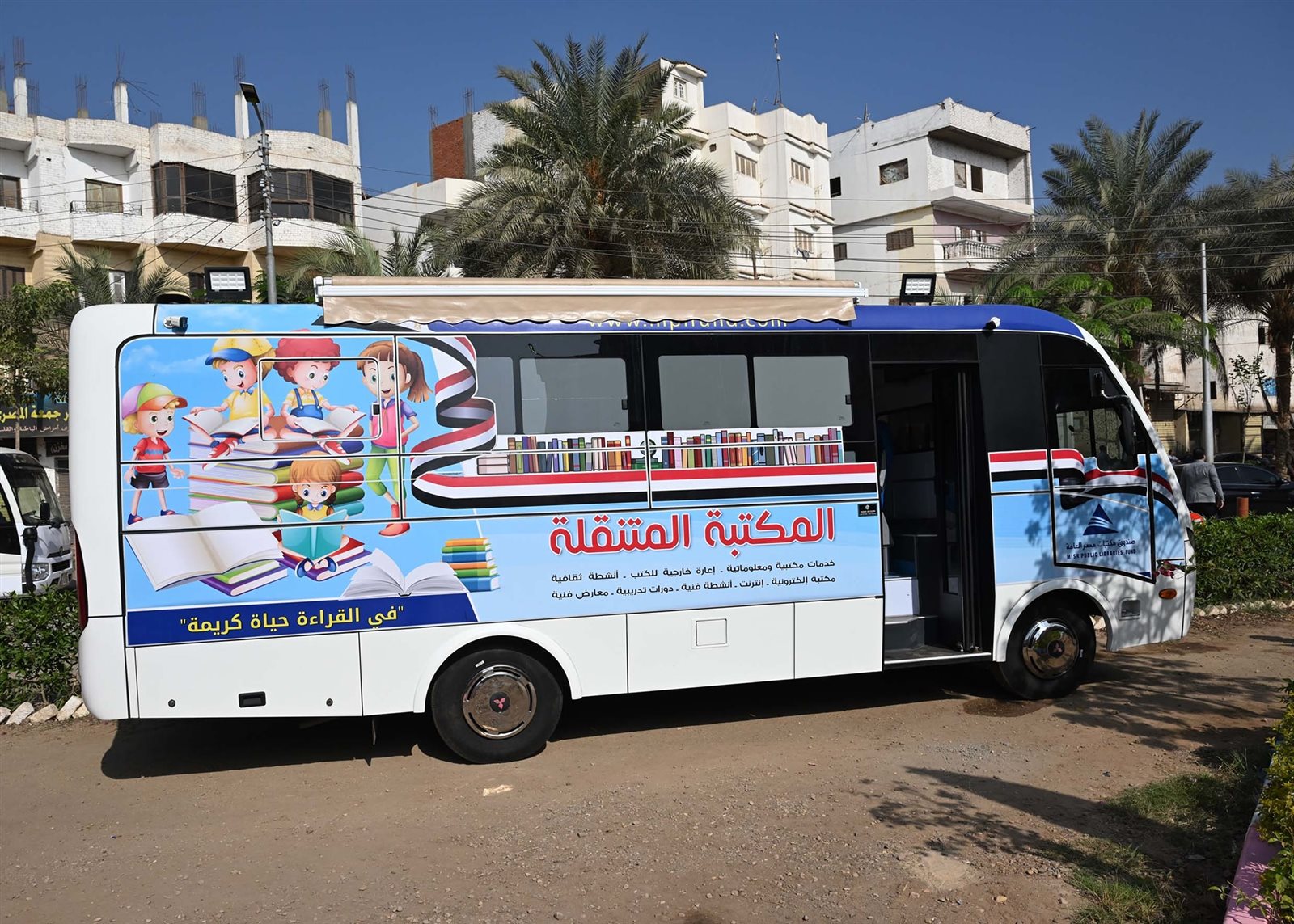 وأضافت أن أنشطة المكتبة لا تقتصر على القراءة فقط، بل تمتد أيضاً لتقديم خدمات فنية متعددة مثل ورش الرسم والتلوين والتشكيل بالصلصال والطباعة على الورق وغيرها من الخدمات، التي تستهدف اكتشاف المواهب ورعايتها، مُضيفةً أن المكتبة مُزودة بشاشة عرض داخلية لعرض أفلام وثائقية تناسب الفئة المستهدفة وخدمة إنترنت ووحدة صوت وتجهيزات مختلفة من كراسي ومناضد للاطلاع، بالإضافة إلى خدمة الـ GPS لضمان سهولة الحركة والتنقل.