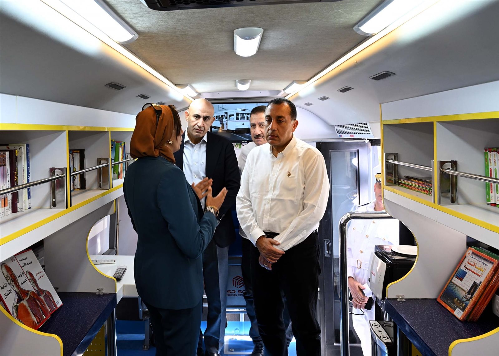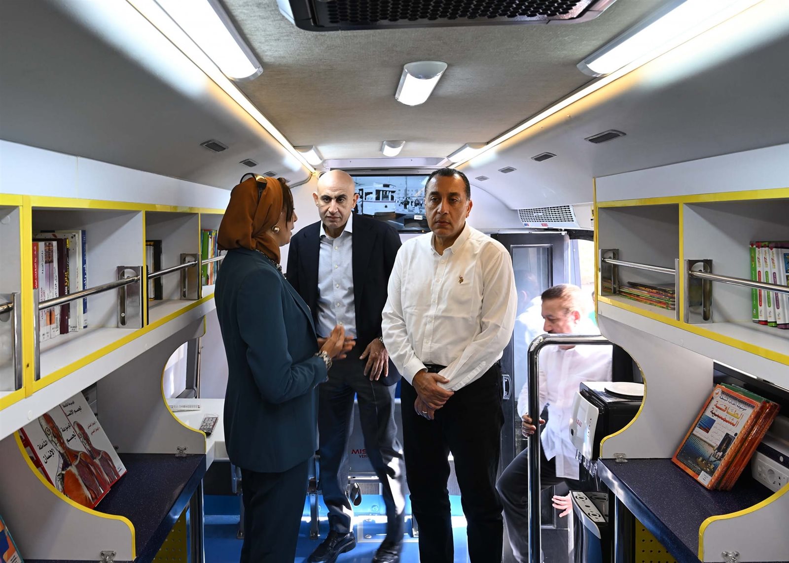 واستمع رئيس الوزراء ومرافقوه، إلى شرح من الدكتورة أميرة الصاوي، إخصائي إعلام وصحافة بمكتب شئون النواب بديوان عام محافظة المنوفية، أوضحت خلاله أن المكتبة المتنقلة بالمنوفية تمثل مشروعاً ثقافياً رائداً يتبع مشروع مكتبات مصر العامة بالمنوفية تضم حوالي 600 كتاب باللغة العربية وبعض اللغات الأخرى في موضوعات مختلفة، وتستهدف القرى البعيدة التي لا يوجد بها مكتبات أو مواقع ثقافية، لافتةً إلى أن المكتبة مجهزة بشكل خاص وفق أحدث الأساليب والنظم الثقافية.