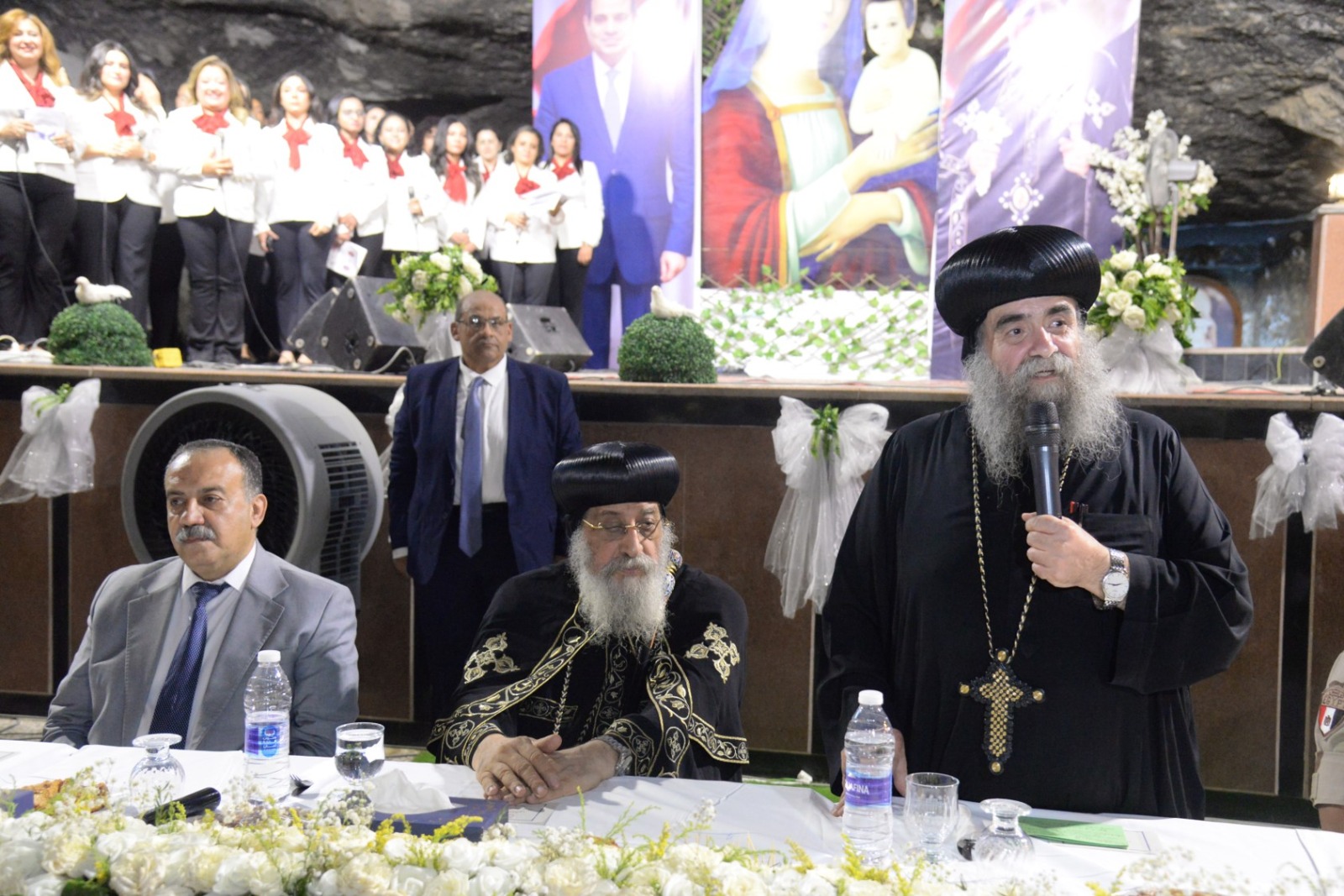 انطلقت الأمسية بالسلام الجمهوري ثم ترانيم قدمها كورال الدير أعقبها كلمة الأنبا يؤانس الذي رحب بالبابا مؤكدا أن أسيوط التي تحتضن على أرضها نقطتين من مسار رحلة العائلة المقدسة تظل شاهدة على تاريخ مصر العريق ورمزا للمحبة والسلام بين أبنائها.