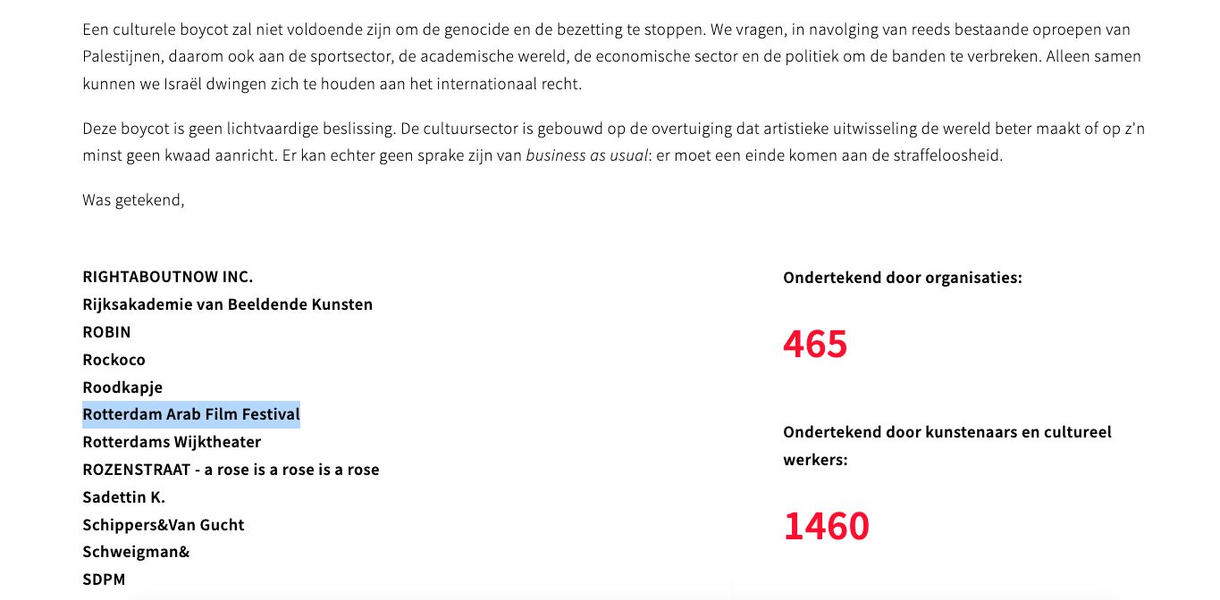 أعلن مهرجان روتردام للفيلم العربي، إلى جانب 465 مؤسسة ثقافية و1500 فنانًا وعاملًا في الحقل الثقافي من هولندا وبلجيكا، دعمه الكامل للموقف الجماعي القاضي بمقاطعة المؤسسات الإسرائيلية المتورطة في انتهاكات حقوق الإنسان وجرائم الإبادة الجماعية ضد الشعب الفلسطيني، وذلك استجابة للنداءات المتكررة من الفنانين والمجتمع المدني الفلسطيني.