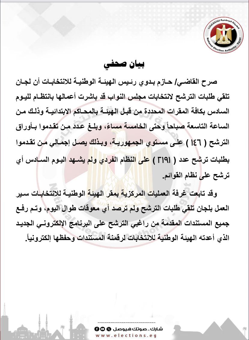 صرح القاضي حازم بدوي رئيس الهيئة الوطنية للانتخابات، بأن لجان تلقي طلبات الترشح لانتخابات مجلس النواب، باشرت أعمالها بانتظام لليوم السادس بكافة المقرات المحددة من قبل الهيئة بالمحاكم الابتدائية وذلك من الساعة التاسعة صباحاً وحتى الخامسة مساءً.