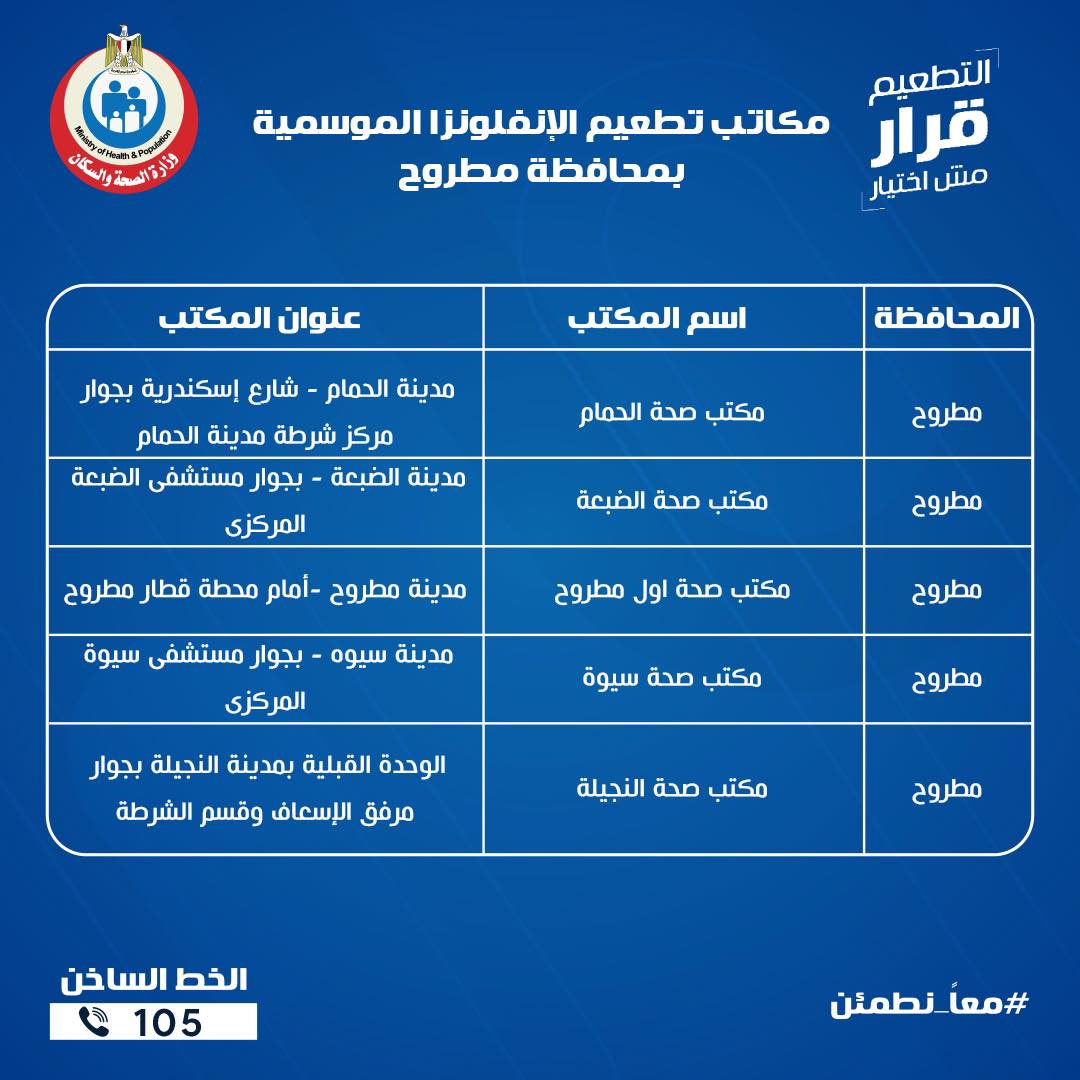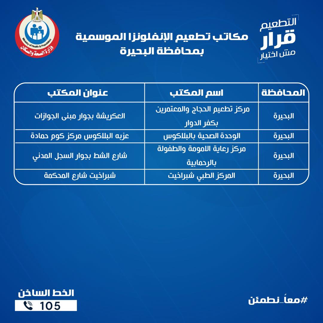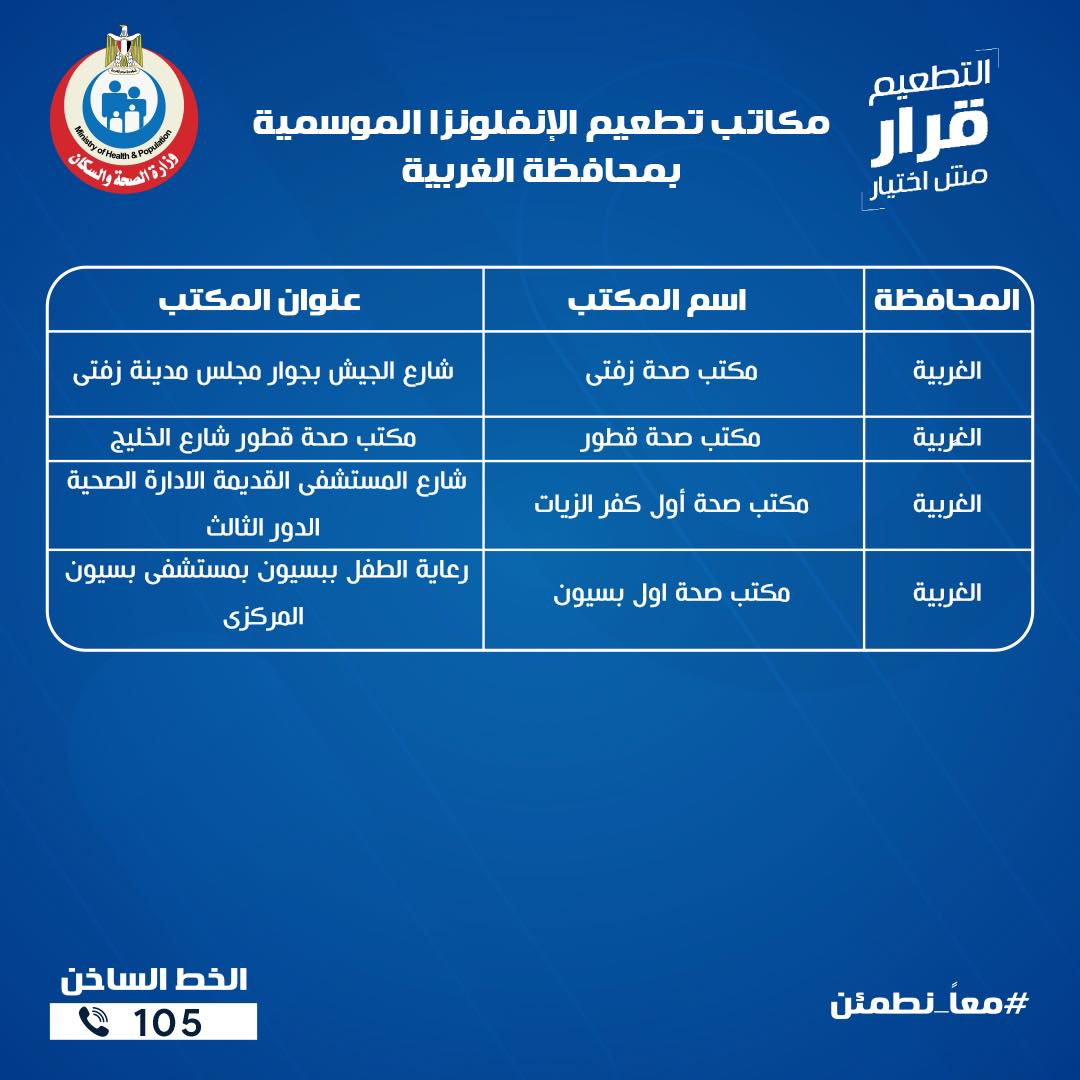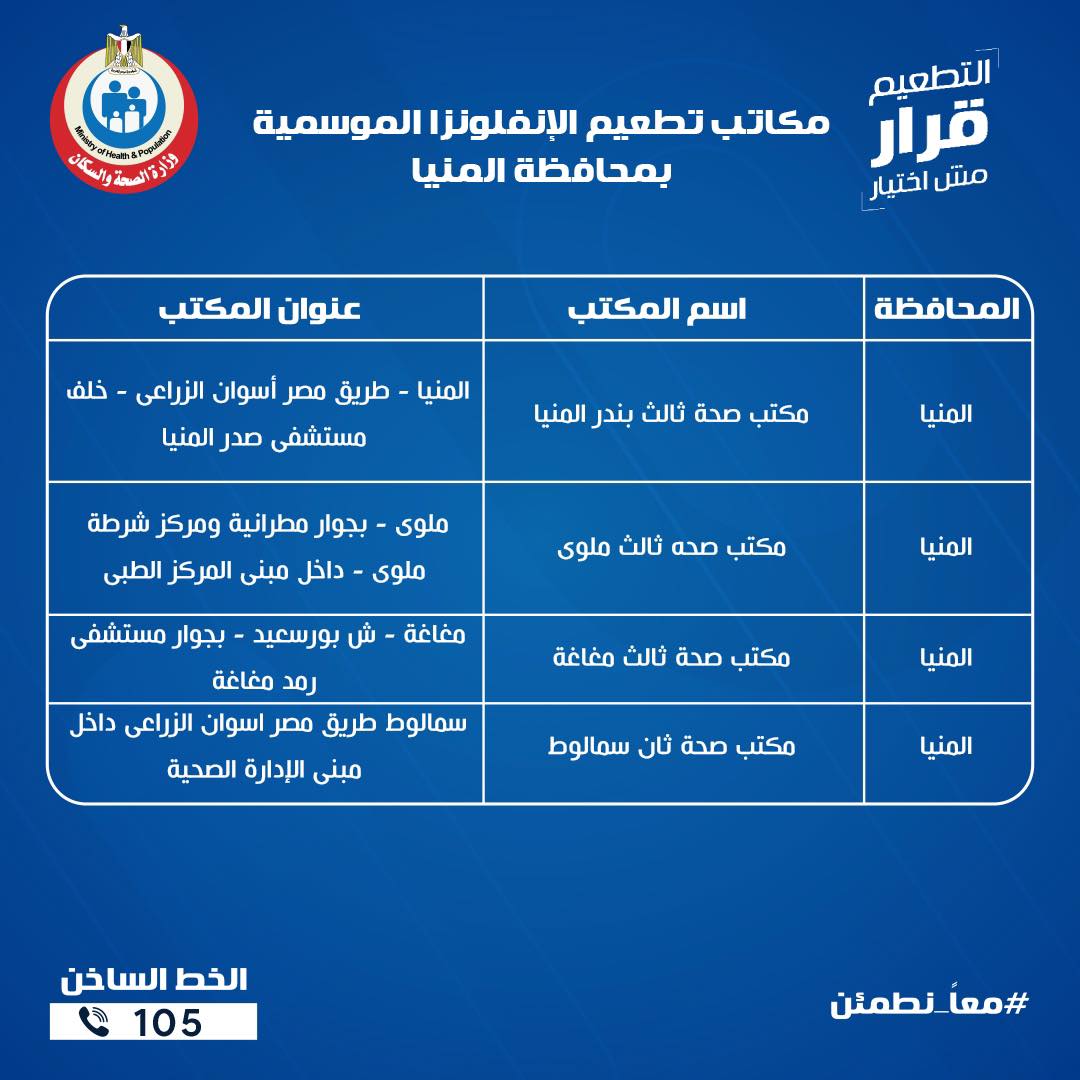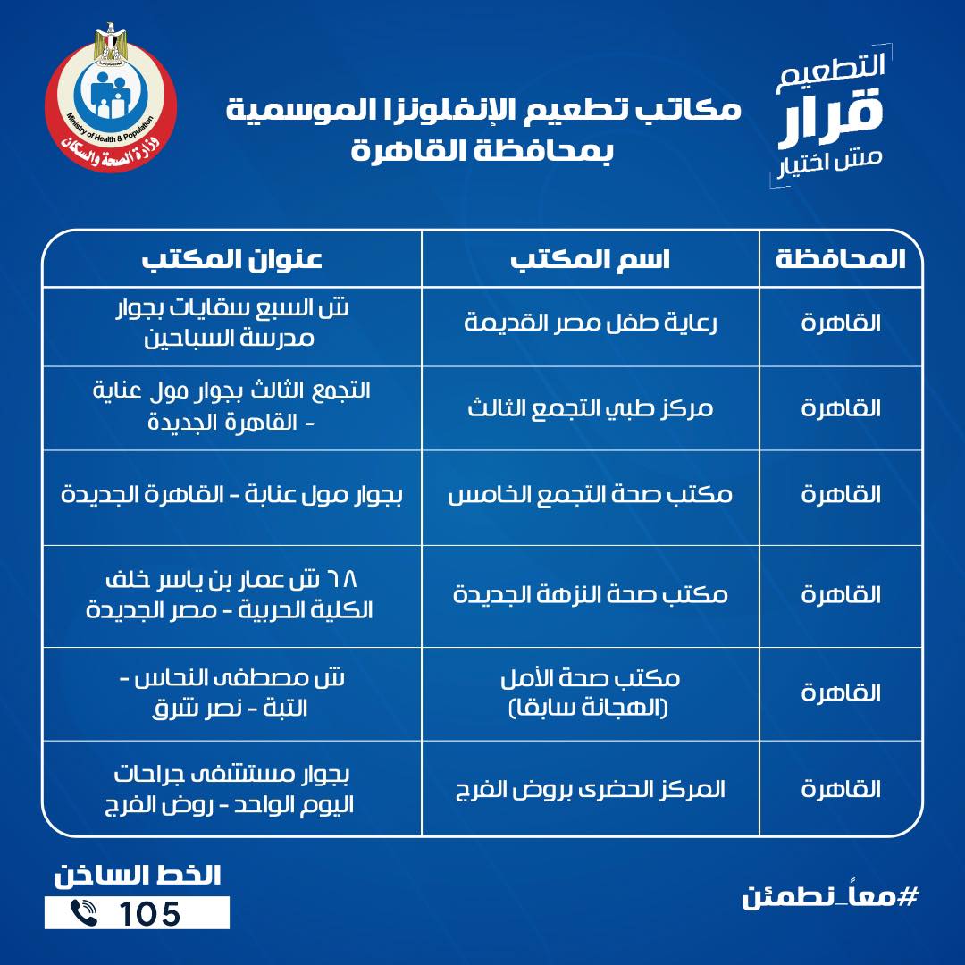 أعلنت وزارة الصحة والسكان عبر صفحتها الرسمية عناوين مكاتب التطعيم ضد الإنفلونزا الموسمية على مستوى الجمهورية، مؤكدة أن اللقاحات آمنة وفعالة وتعد من أهم الوسائل الوقائية لتقليل فرص الإصابة وتفادي مضاعفات المرض خاصة مع اقتراب فصل الشتاء.