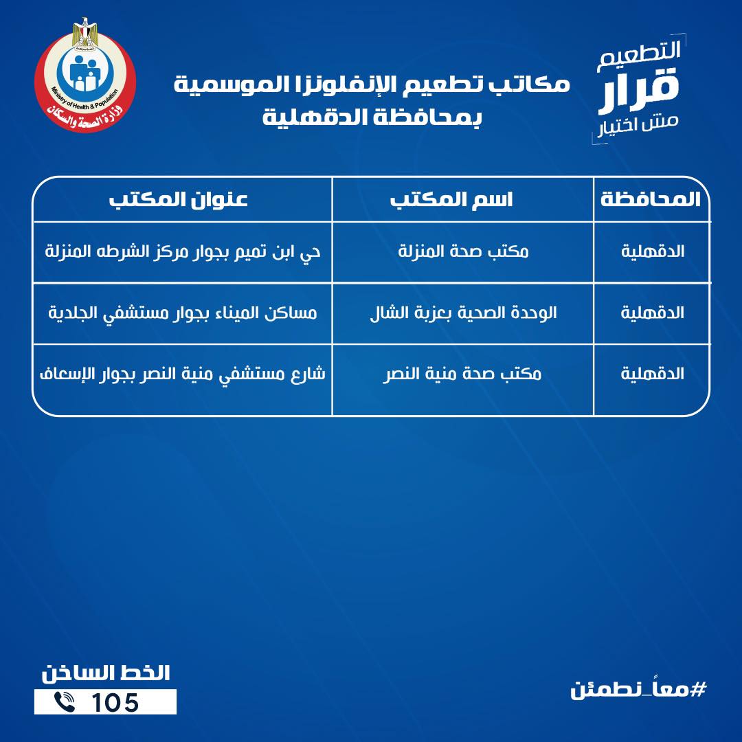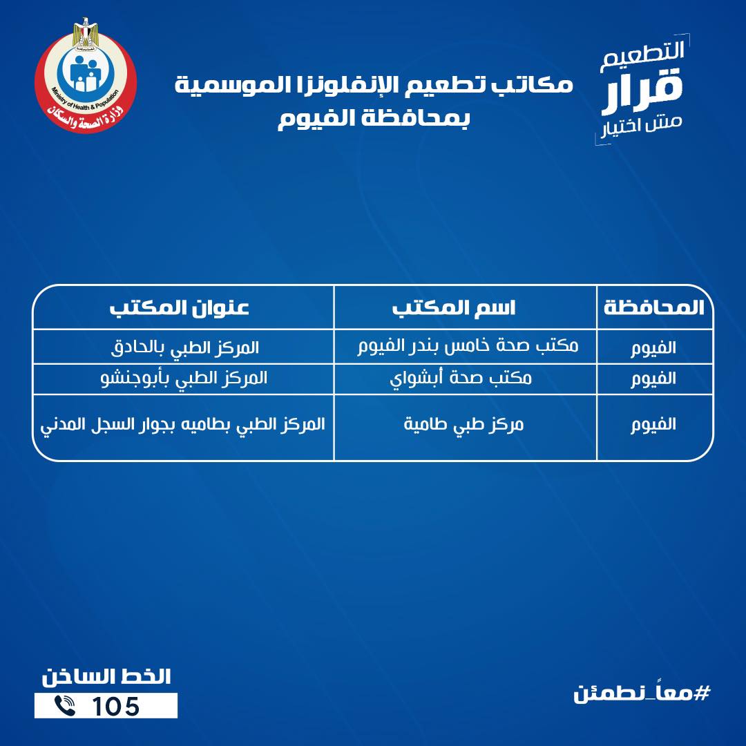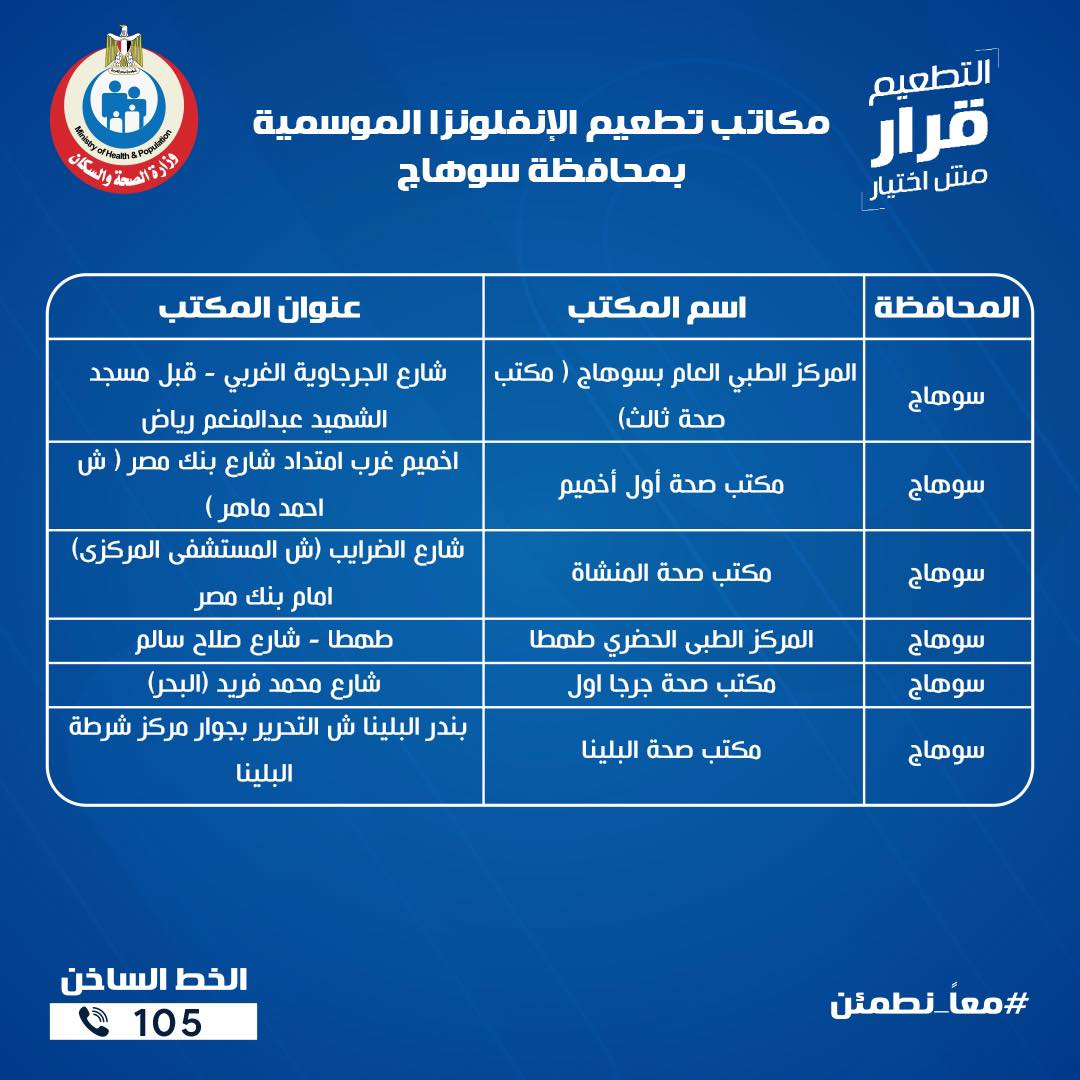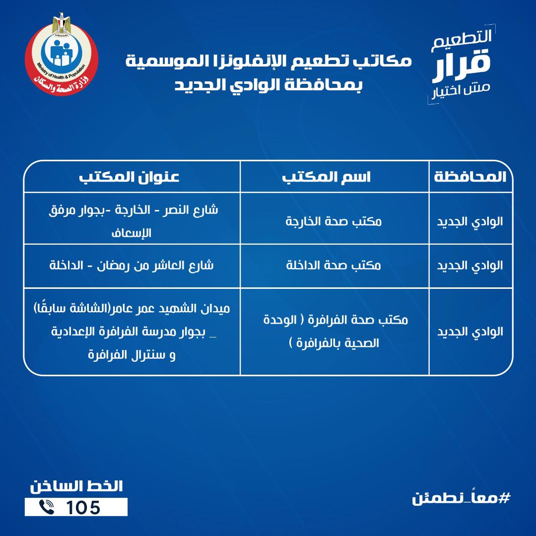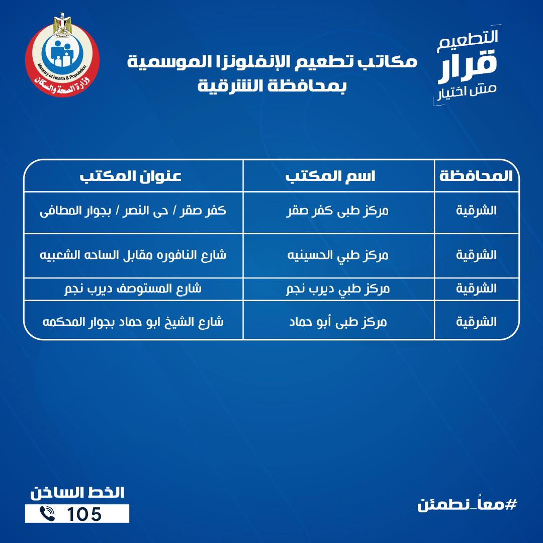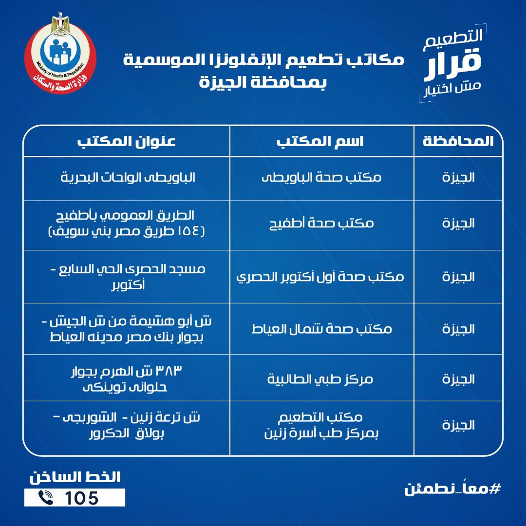 أعلنت وزارة الصحة والسكان عبر صفحتها الرسمية عناوين مكاتب التطعيم ضد الإنفلونزا الموسمية على مستوى الجمهورية، مؤكدة أن اللقاحات آمنة وفعالة وتعد من أهم الوسائل الوقائية لتقليل فرص الإصابة وتفادي مضاعفات المرض خاصة مع اقتراب فصل الشتاء.