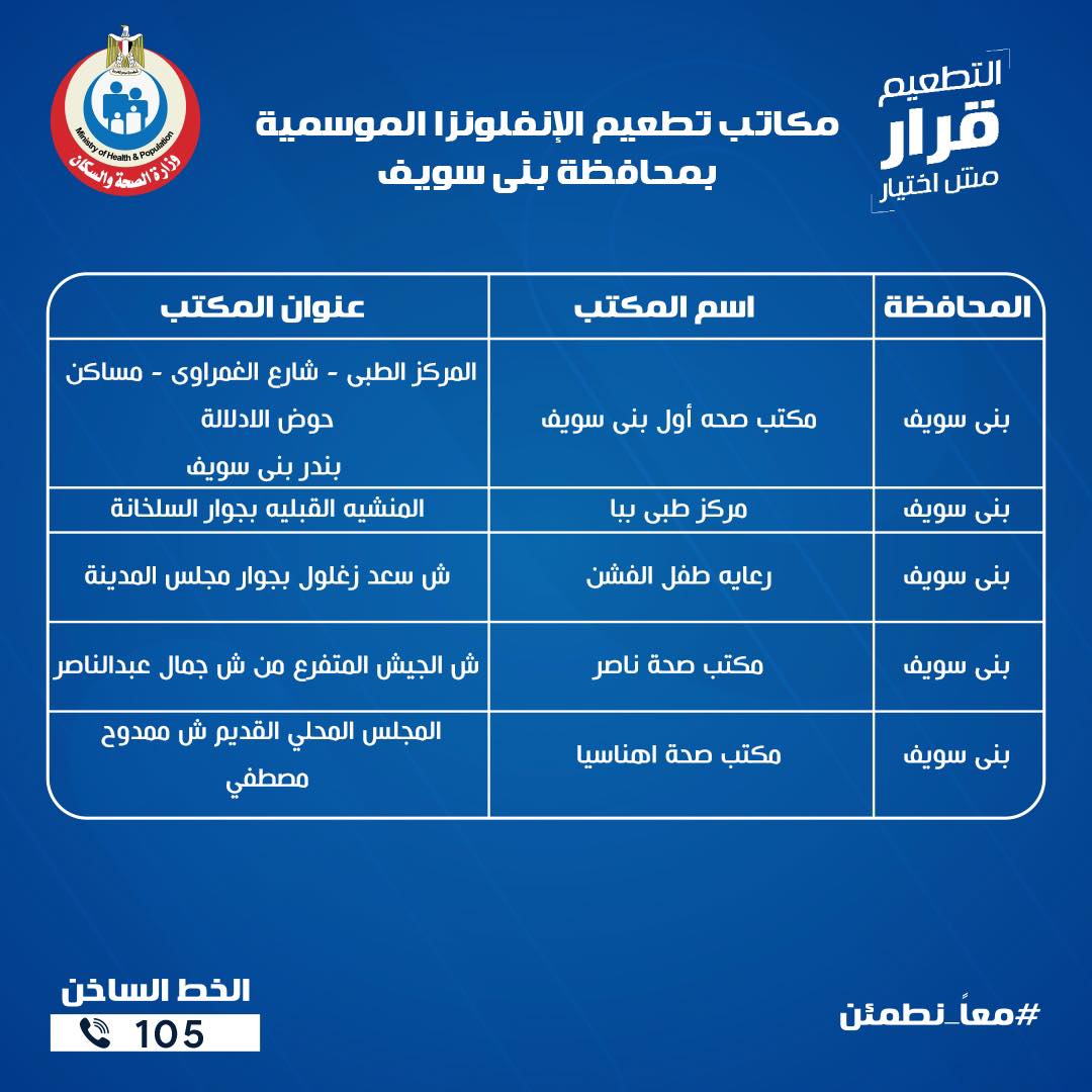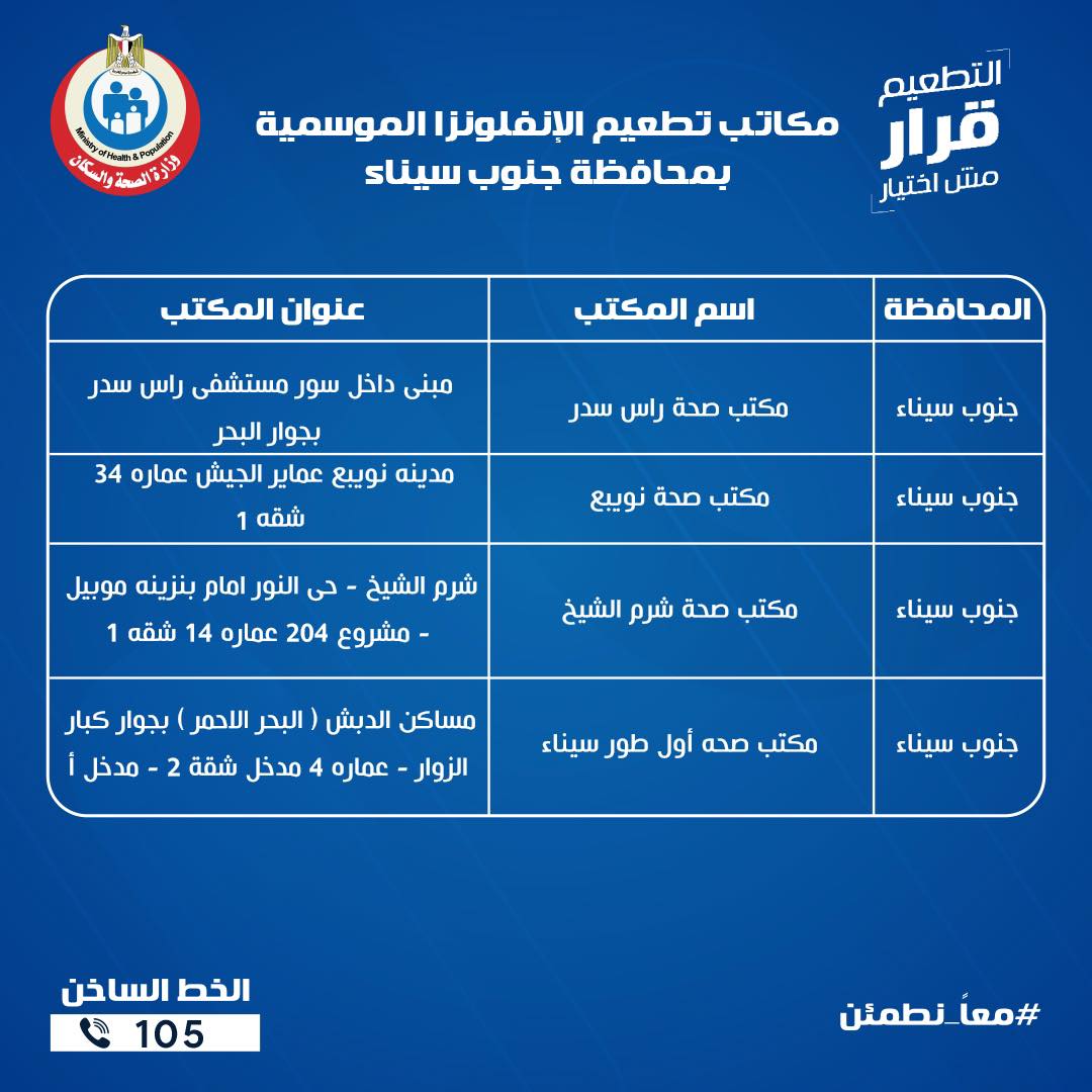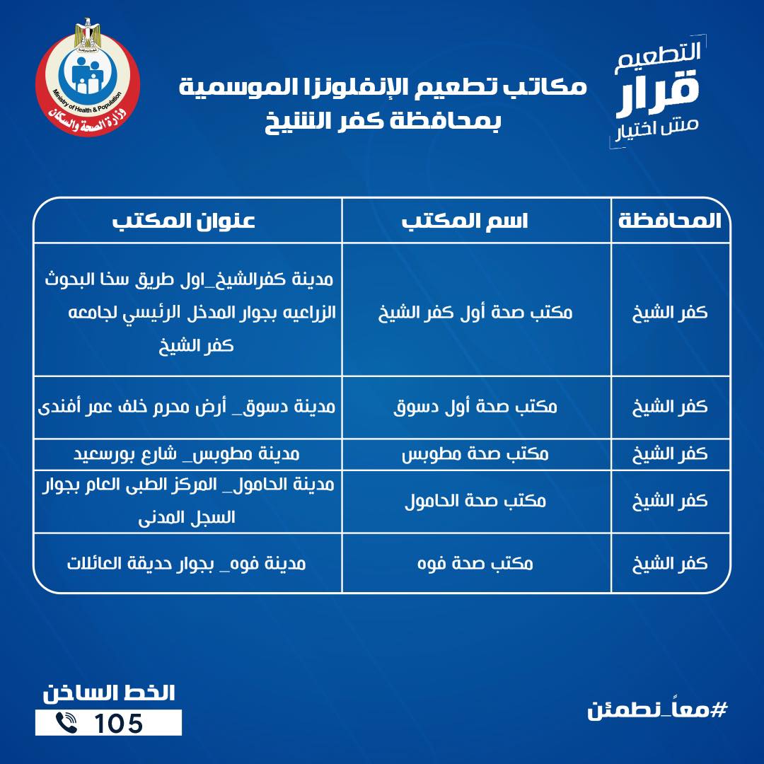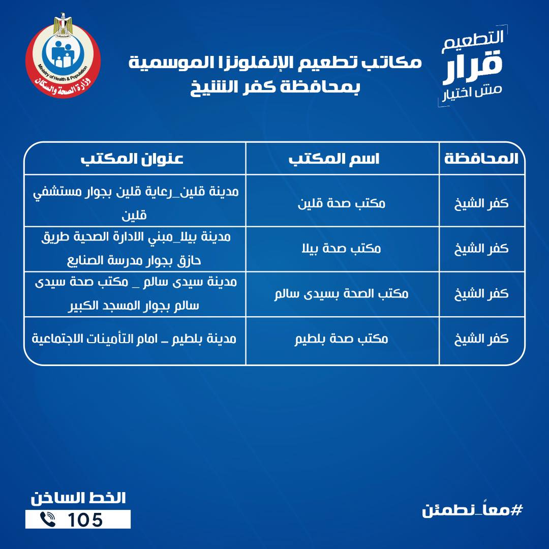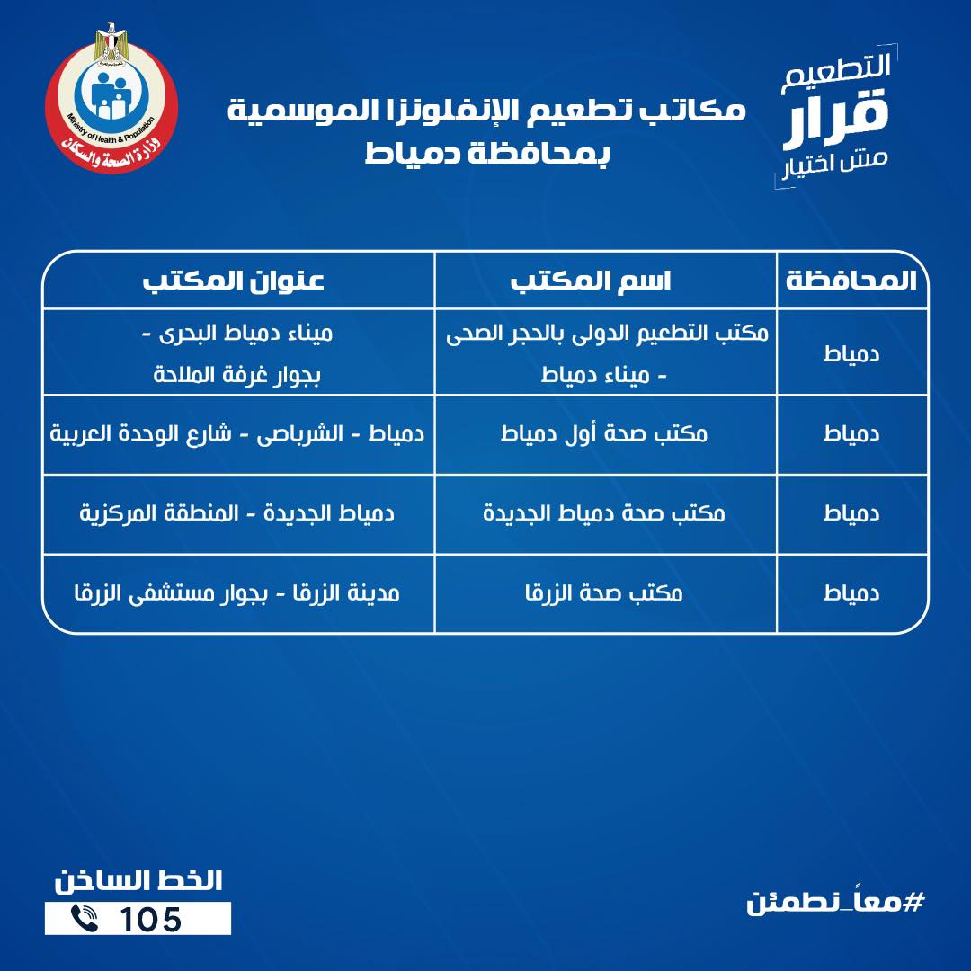 أعلنت وزارة الصحة والسكان عبر صفحتها الرسمية عناوين مكاتب التطعيم ضد الإنفلونزا الموسمية على مستوى الجمهورية، مؤكدة أن اللقاحات آمنة وفعالة وتعد من أهم الوسائل الوقائية لتقليل فرص الإصابة وتفادي مضاعفات المرض خاصة مع اقتراب فصل الشتاء.
