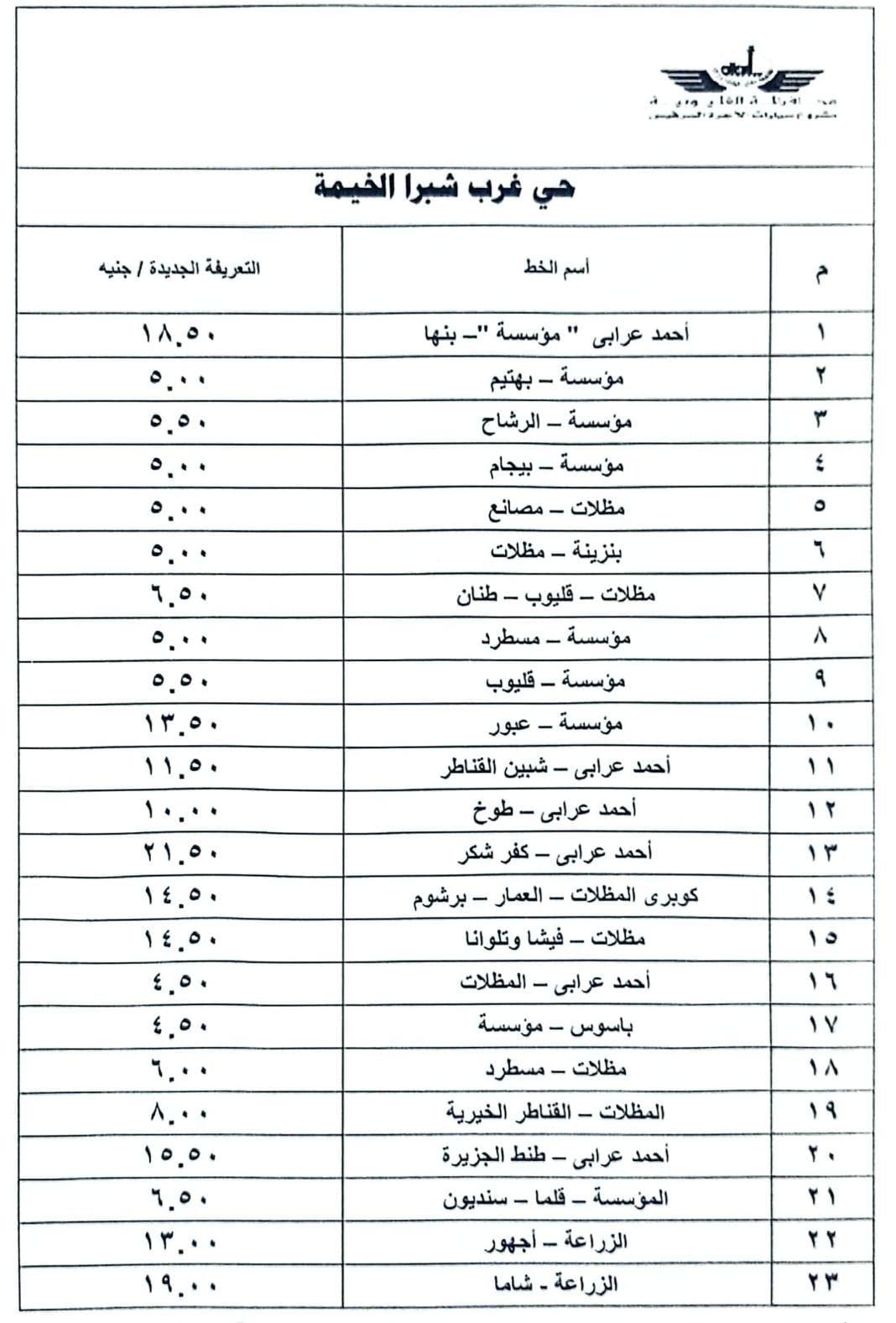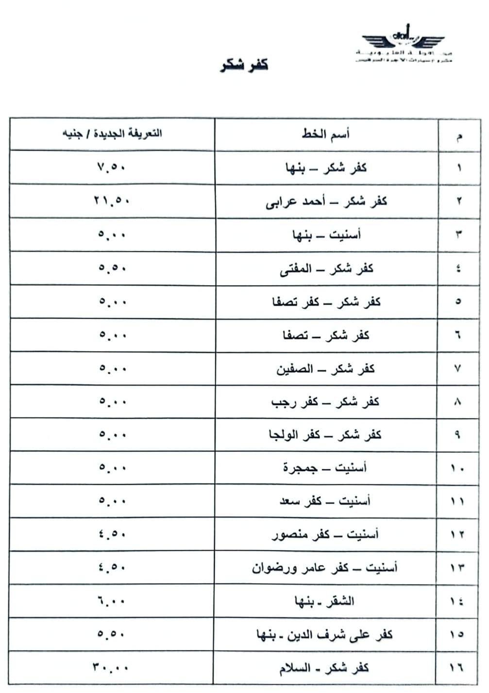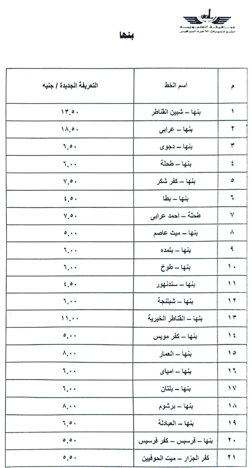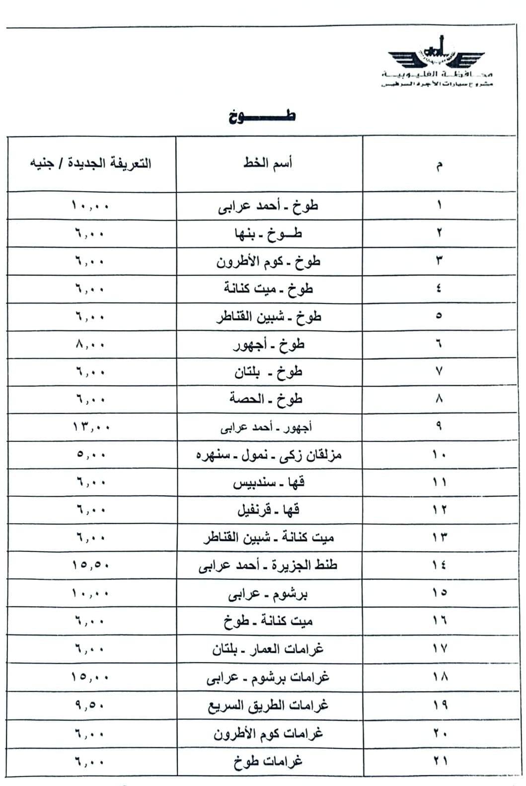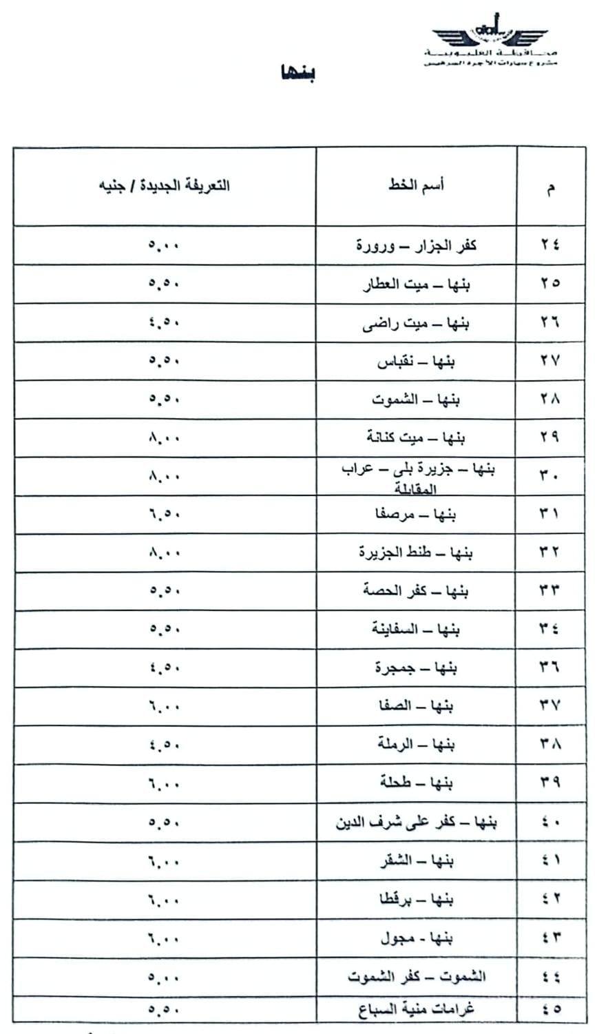 تعريفة الركوب الجديدة بالقليوبية