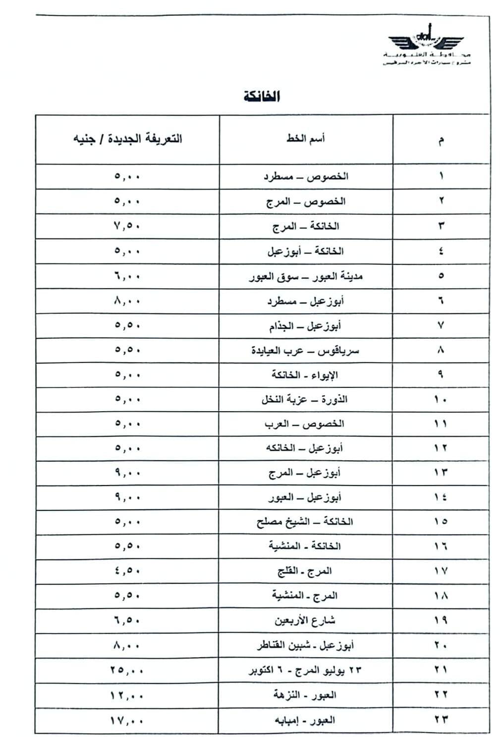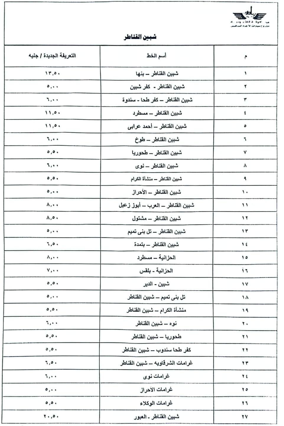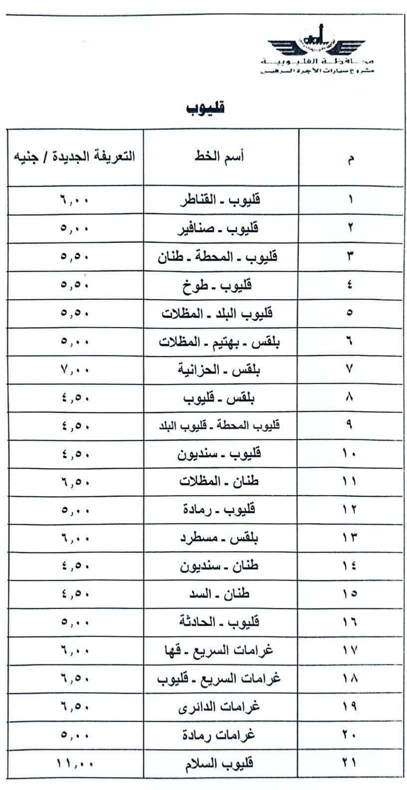 وأصدر محافظ القليوبية قرارًا بتشكيل لجنة لتعديل التعريفة الجديدة والمقررة لركوب سيارات الأجرة والسرفيس بدائرة المحافظة للخطوط الطويلة والداخلية، لمواكبة الزيادة في أسعار الوقود، والتي شملت: