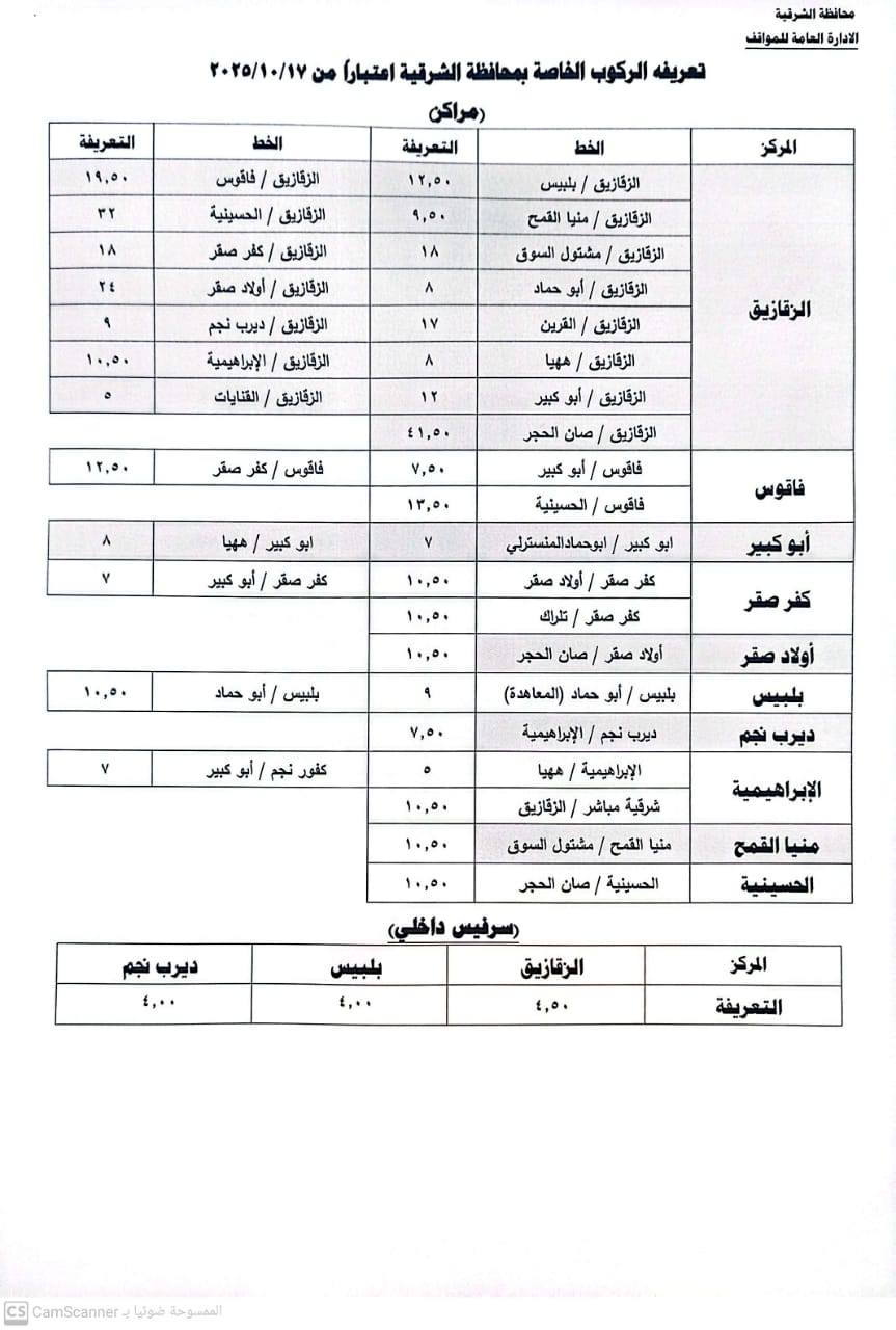وأصدر محافظ الشرقية، قرارًا بتعديل تعريفة الركوب لسيارات التاكسي العداد بمدن المحافظة ليكون فتح «البنديرة» 13جنيهًا تشمل كيلو متر واحد على أن تزداد القيمة بواقع 3.5 جنيه لكل كيلو متر واحد، و10 جنيهات لساعة الانتظار الأولى، وتزداد بواقع 9.5 جنيه لكل ساعة إضافية، كذلك تعديل تسعيرة الركوب لسيارات السرفيس داخل مدينة الزقازيق لتكون 4.5 جنيه، وداخل مدينة بلبيس 4 جنيهات وداخل مدينة ديرب نجم 4 جنيهات.