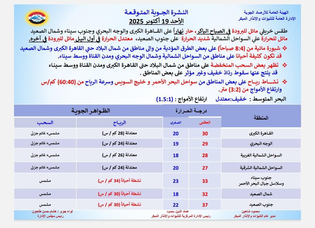 يتوقع خبراء هيئة الأرصاد الجوية أن يسود غدا الأحد طقس حار نهارا على القاهرة الكبرى والوجه البحري وجنوب سيناء وشمال الصعيد، مائل للحرارة على السواحل الشمالية، شديد الحرارة على جنوب الصعيد..بينما يسود طقس معتدل الحرارة في أول الليل مائل للبرودة في آخره.