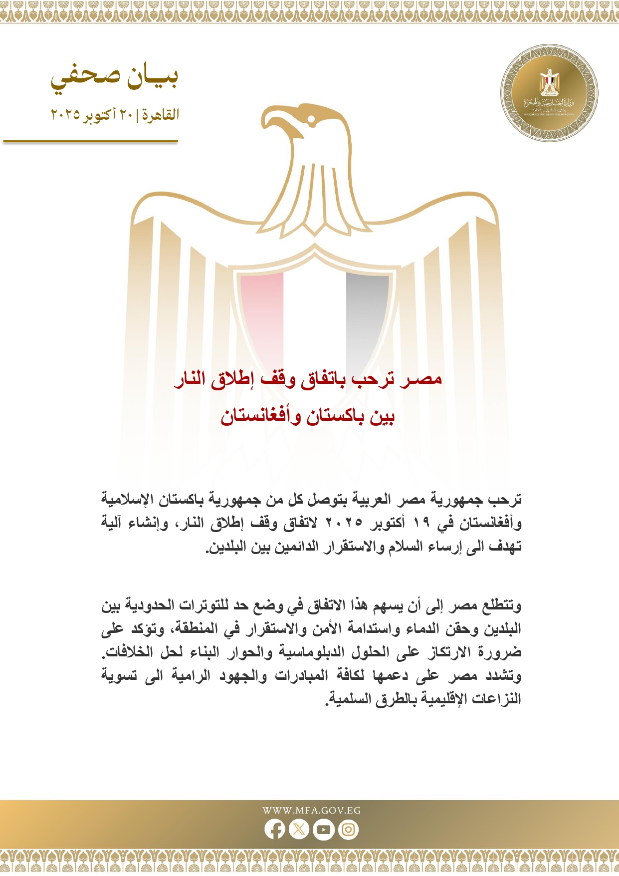 مصر ترحب باتفاق وقف إطلاق النار بين باكستان وأفغانستان