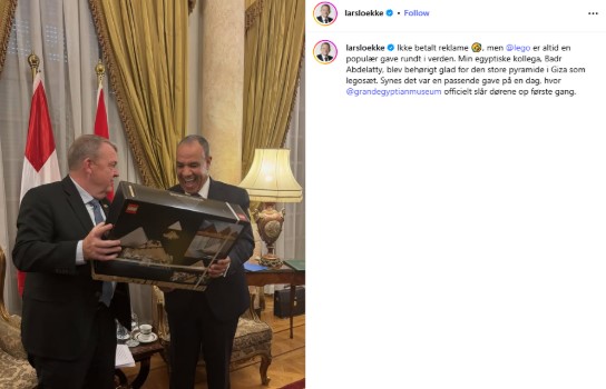 وقال وزير خارجية الدنمارك: «ليست إعلانات مدفوعة، لكن مجموعات ليجو من هدايا العالم المحببة دائمًا، زميلي المصري بدر عبدالعاطي، كان مسرورًا جدًا بمجسم الهرم الأكبر، وكانت هدية مناسبة تمامًا بمناسبة افتتاح المتحف المصري الكبير أبوابه رسميًا لأول مرة».